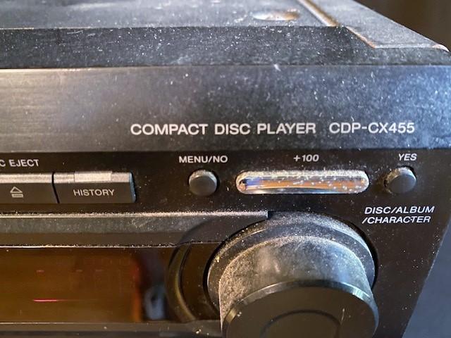 Model CDP-CX455 Mega Storage 400 CDS. Includes unknown number of CDs in machine. Includes remote. Powers on at time of cataloging. Measurement: 17"W x 18"L x 8"D