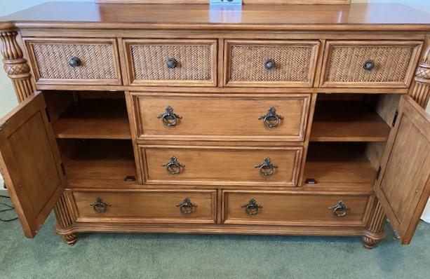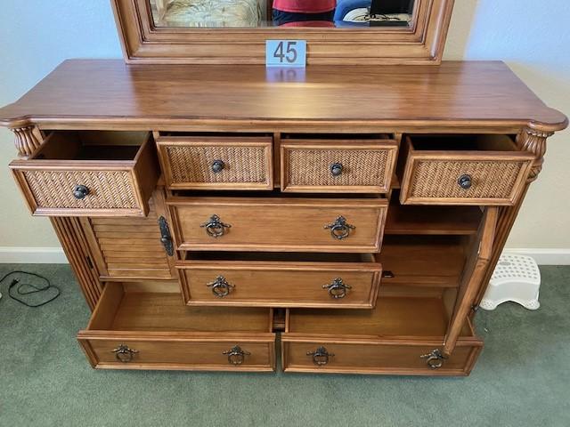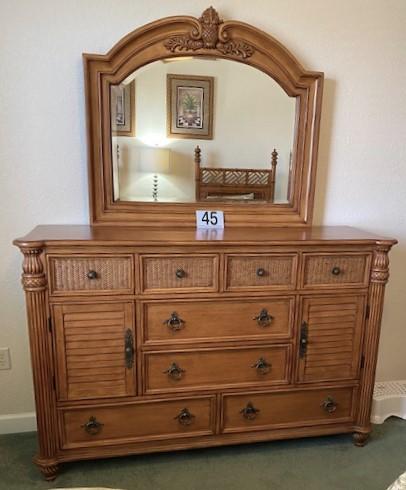 Coastal style. 8 drawers and two compartments. Detachable mirror. Estimated weight of lot: 200 lbs. Measurement: 45"H x 68"W x 19"D (dresser) 40"H x 46"W (mirror)