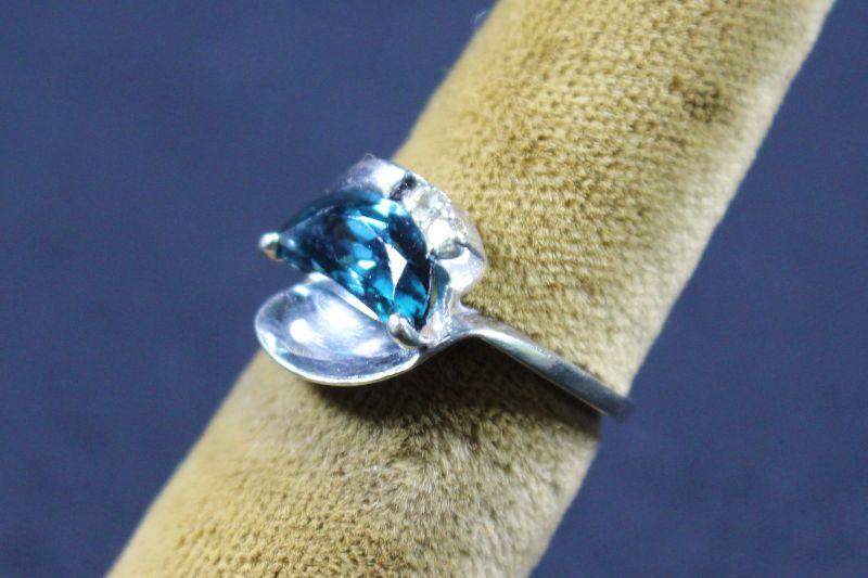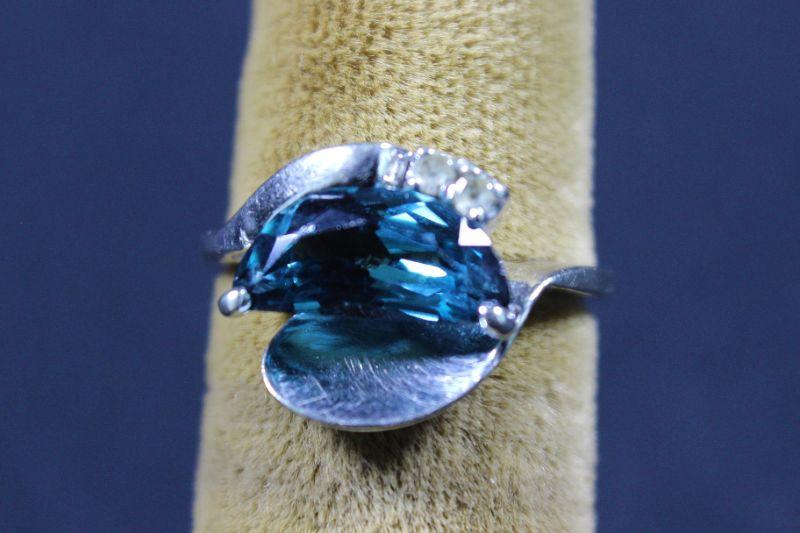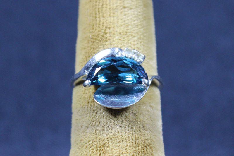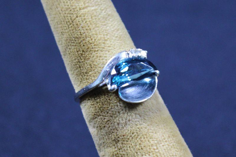 Sky blue colored stone with two clear colored brilliant cut stones.