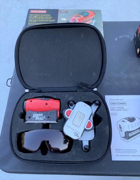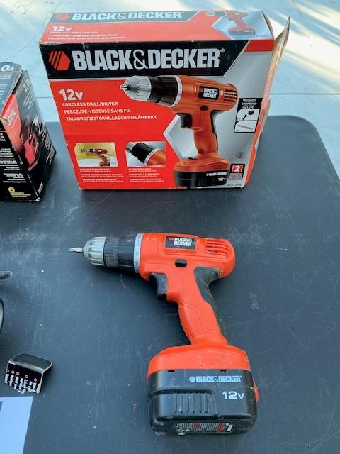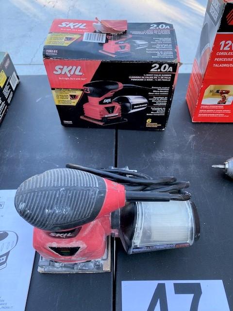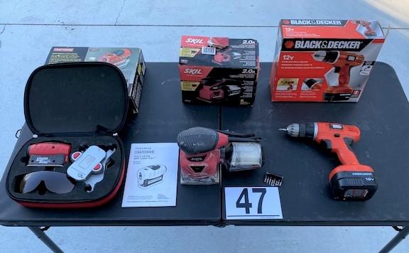 Includes: 12v drill (missing charger), Skil Palm Sander, Craftsmen laser track. All power on at time of cataloging.