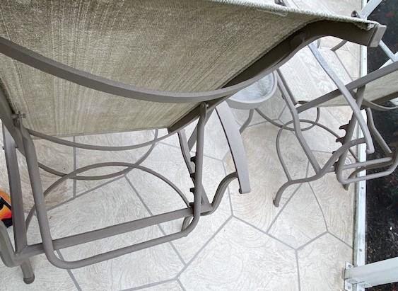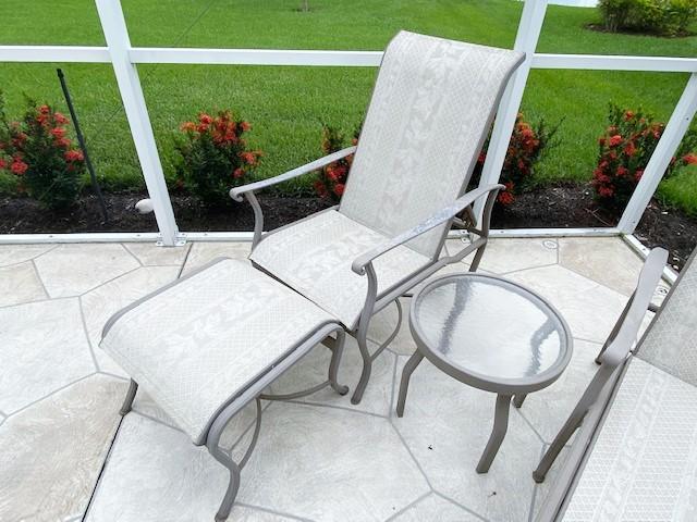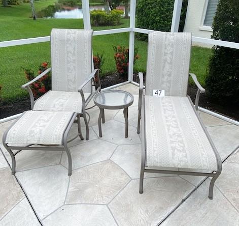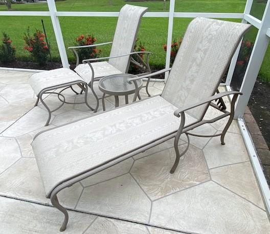 Includes: adjustable chaise lounge & an adjustable chair and ottoman with a center table. All the pieces are cast aluminum with some surface oxidation. Estimated weight of lot: 35lbs. Measurement: 62"L x 43"H x 24"W (chaise lounge)