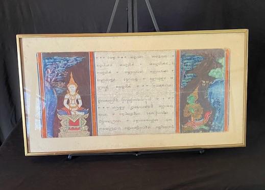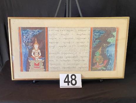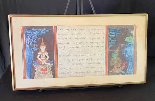 According to appraisal: "Thai polychrome decorated pages from an accordion type book. Framed & matted under glass. Left side depicts a seated Buddha and right side has a green skinned deity." Foxing on matting. Estimated weight of lot: 2lbs. Measurement: 29 3/4"L x 15 3/4"H
