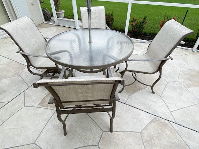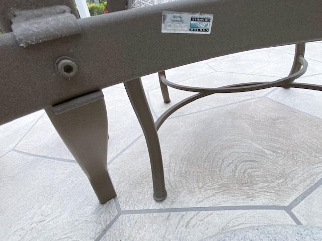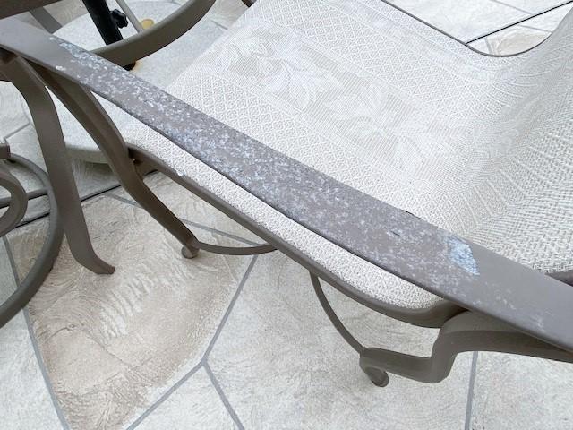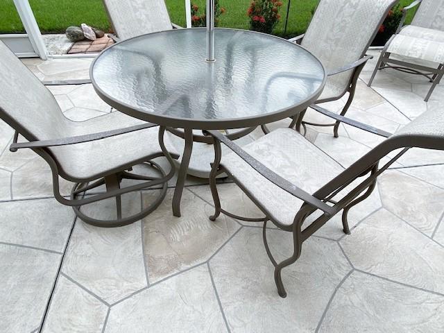 Cast aluminum umbrella table with four chairs. Has umbrella & umbrella stand. With some surface oxidation. Estimated weight of lot: 250lbs. Measurement: 48"diameter x 28"H (table without umbrella) | 38"H (chair; each)