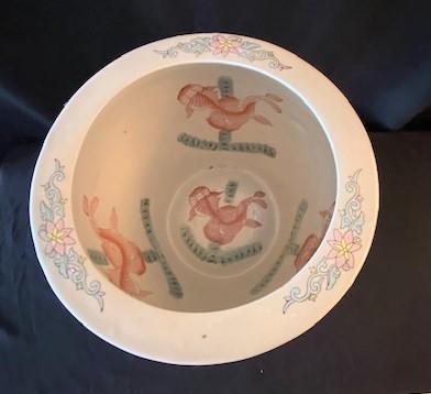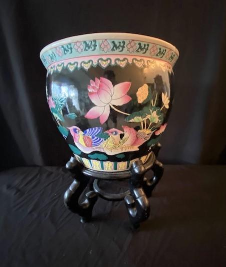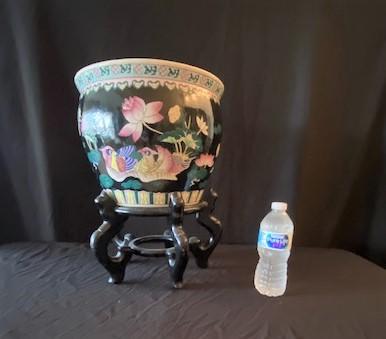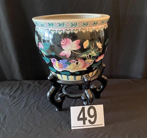 LOT#49LR: Asian Coy Vase w/ Mahogany Stand