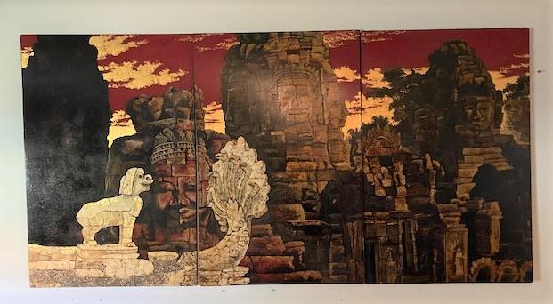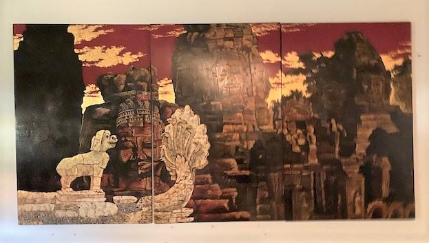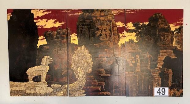According to appraisal: "Three panel painting of stone effigies at Bayon (Temple at Anknor Wat). Painting has inlaid eggshell and mother of pearl. Signature in lower right not intelligible." Estimated weight of lot: 40lbs. Measurement: 70"L x 35 1/2"H