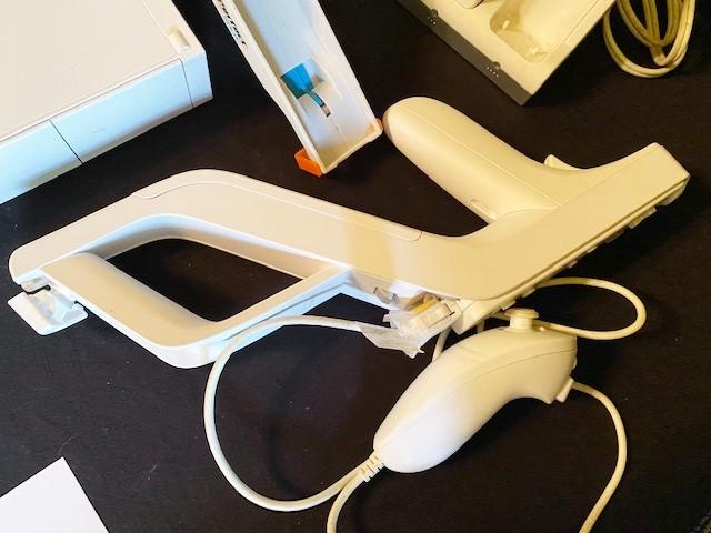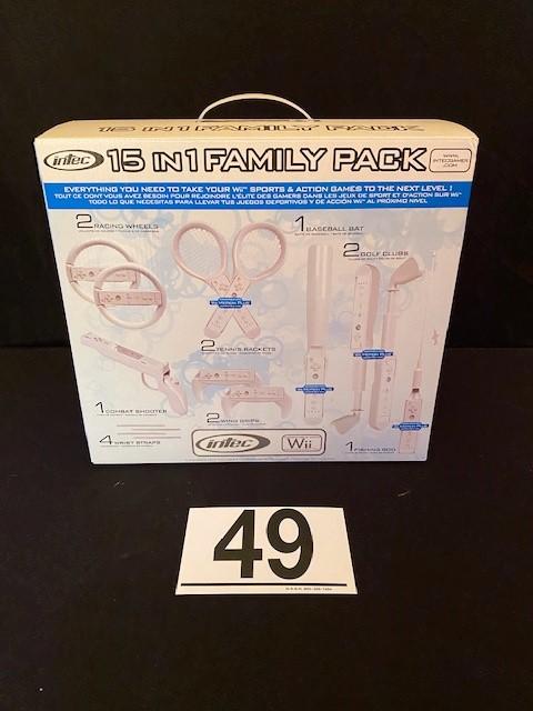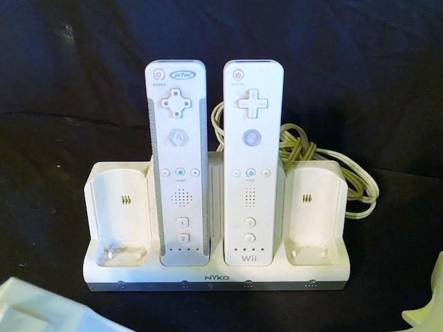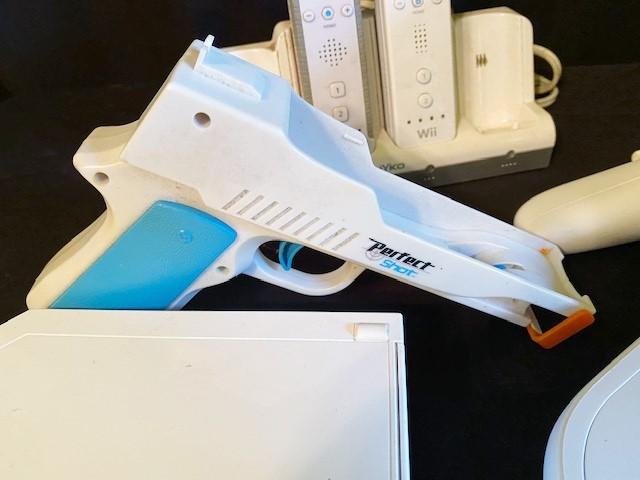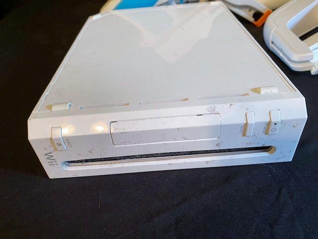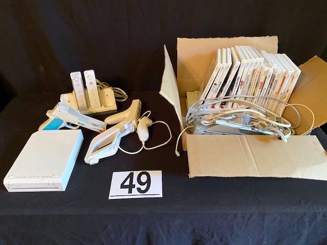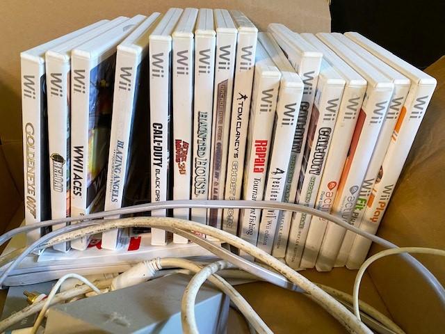 Includes Wii console, 18 games, 3 controllers, Wii Fit balance board, and more. Games include Call of Duty, Rapala Tournament Fishing, Ghost Recon, Blazing Angels, and more. Untested. Measurement: 16"L x 13"W x 10"D (all together)