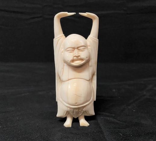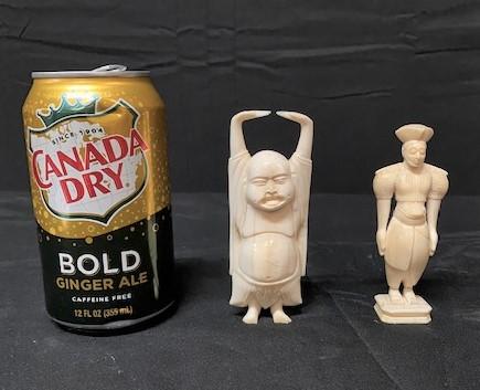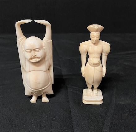One is Buddha; one looks like a guard. Each have slight damage. No signatures. Measurement: 4"H (Buddha) 3 3/4"H (guard)