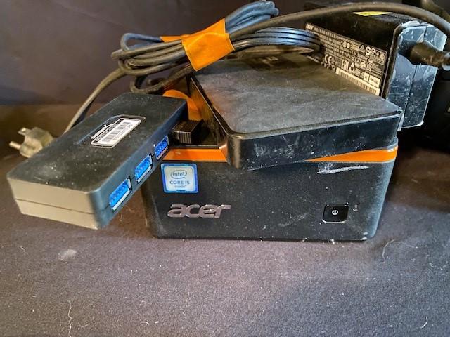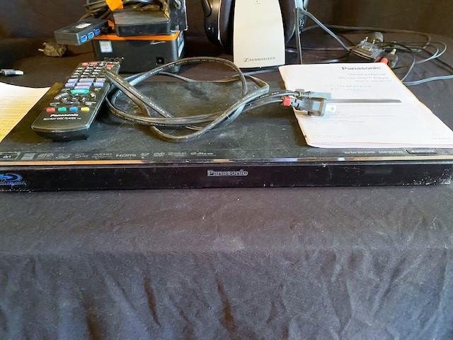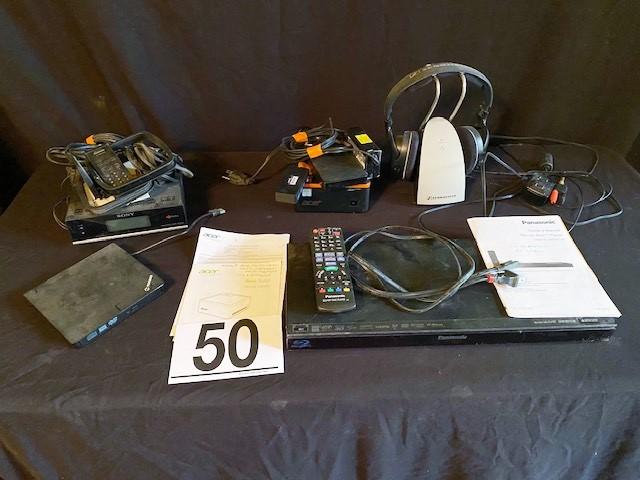 Includes Sennheiser Headphones, Panasonic Blu-Ray Disc Player, Sony HD Radio, external DVD drive, and Acer Revo. All untested.