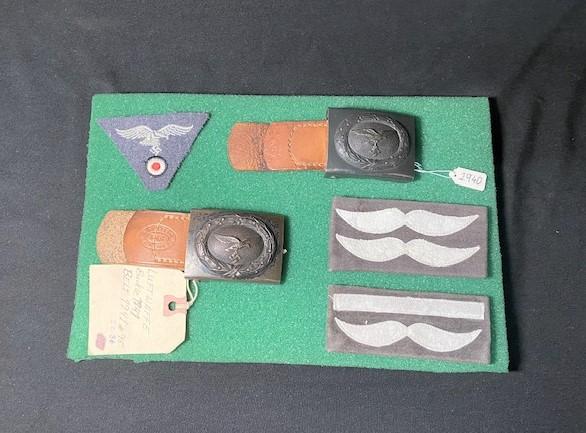 Includes: 1940 & '41 belt buckles, M43 trapezoid cap insignia & more. Estimated weight of lot: 1lbs. Measurement: 5" x 3 1/2" (largest)