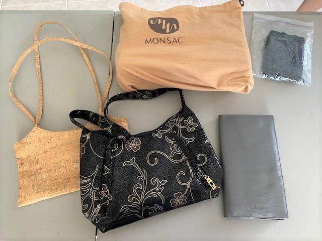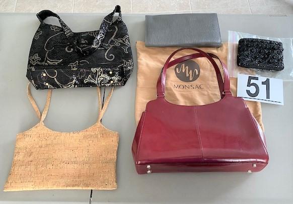 Including: Monsac appears to be red leather, cork purse made in USA, Pinky, Magid, & travel portfolio.
