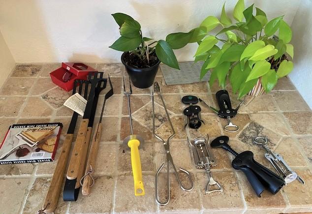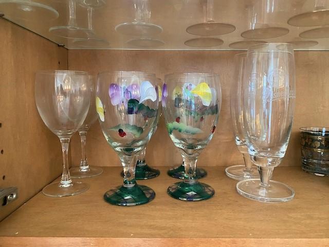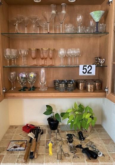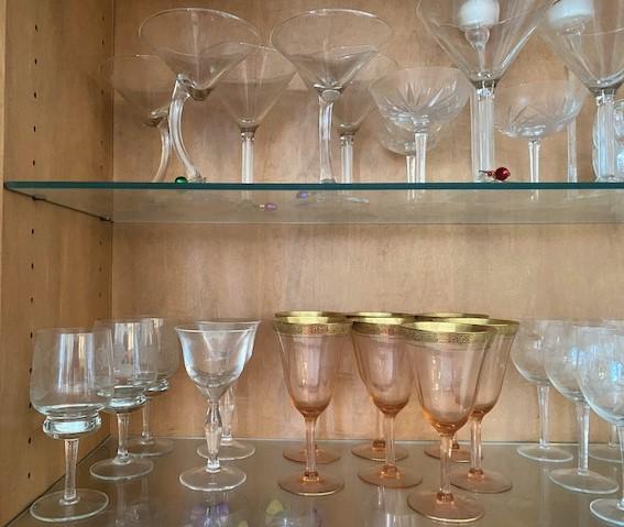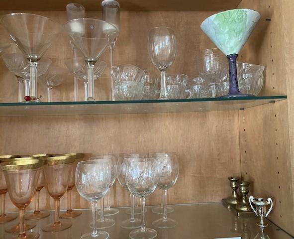 Includes highball glasses, wine glasses, rocks glasses, martini glasses, and more. Some pieces are mid-century. Also includes two live plants. 30+ pieces.