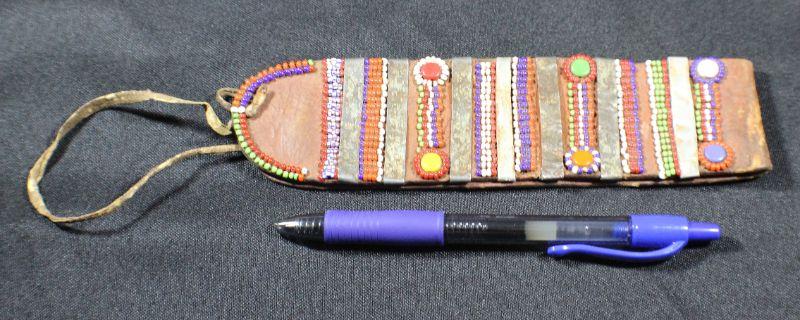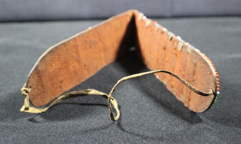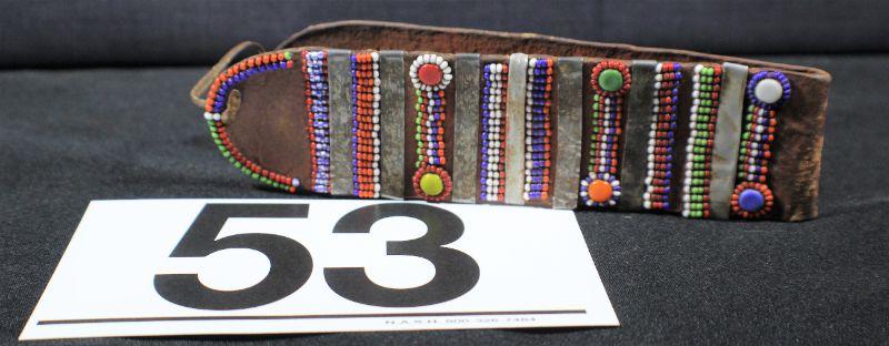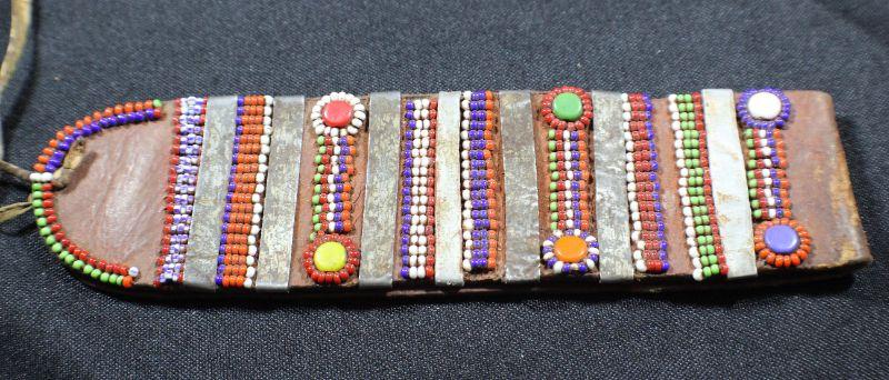 Made from 'gonita' or glass beads, metal stripes & leather. Measurements: 7"L X 2"W.