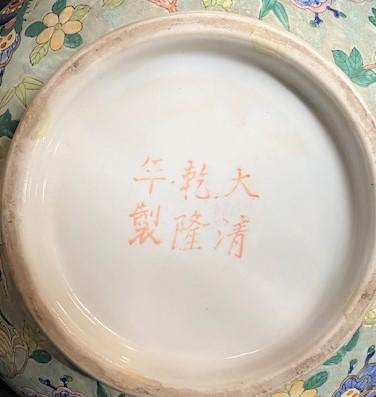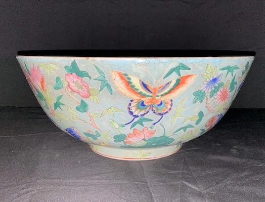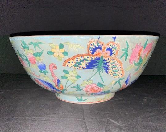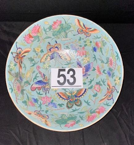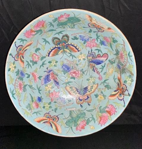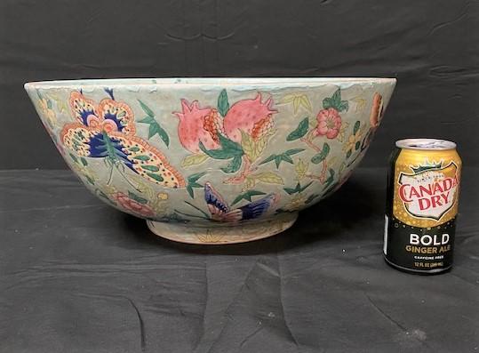 Signed. Butterflies, flowers & pomegranates on bowl. Measurement: 16 3/4" diameter x 7 1/2"H