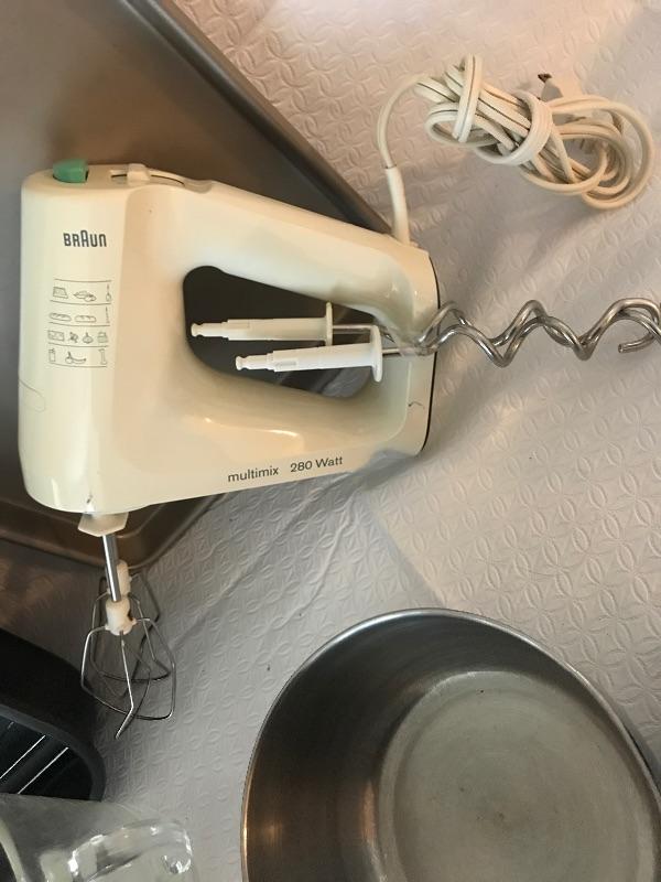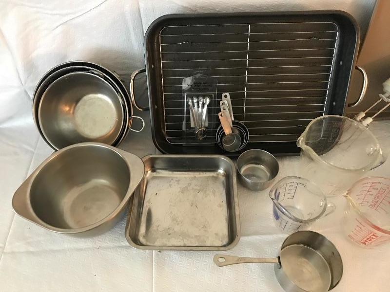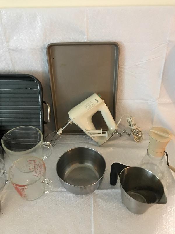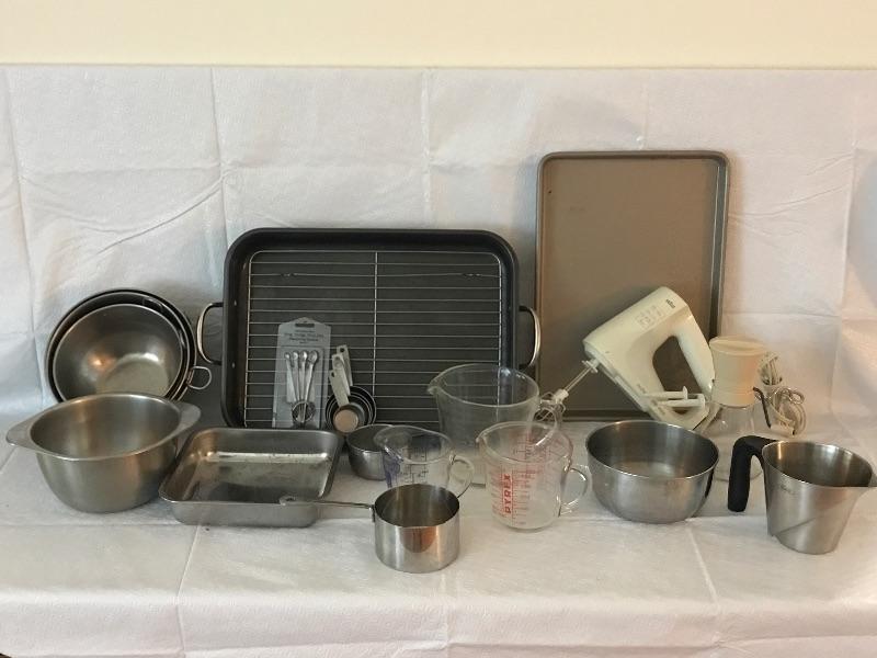 Lot of bakeware includes six mixing bowls of different sizes, large roasting pan with rack, three Pyrex liquid measuring cups, One liquid measuring cup by 0XO, chopper, cookie sheet, small square baking pan, Drop smidge pinch hint measuring spoons and a Braun Multi Mix 280 watt electric mixer with 2 kinds of beaters