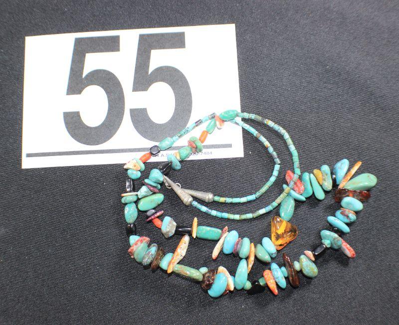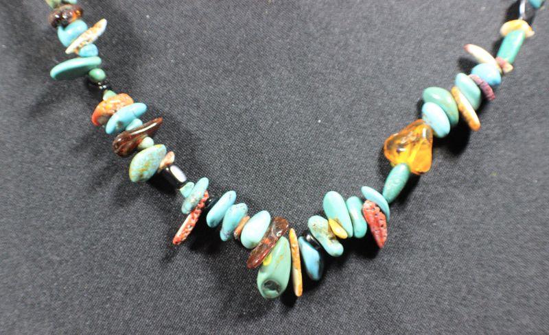 Believed to be Hopi. Assorted stones include: turquoise, coral, onyx, jasper, amber& more. 78g. Measurement: 26"L (approximately)