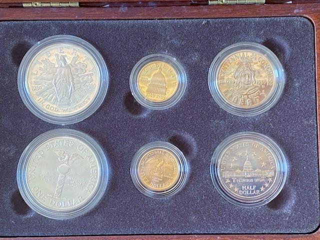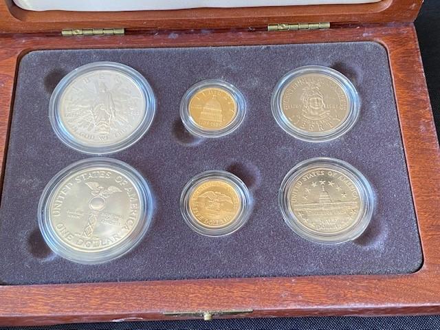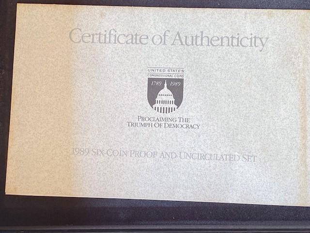 Includes: 1989 $5 Gold Mint W, 1989 Silver Dollar Proof Mint S and 1989 Half Dollar Proof Mint S. Wood display. Pre-Auction Estimate: $1,000