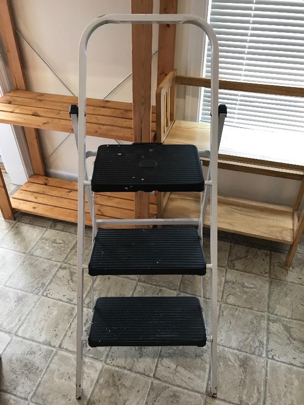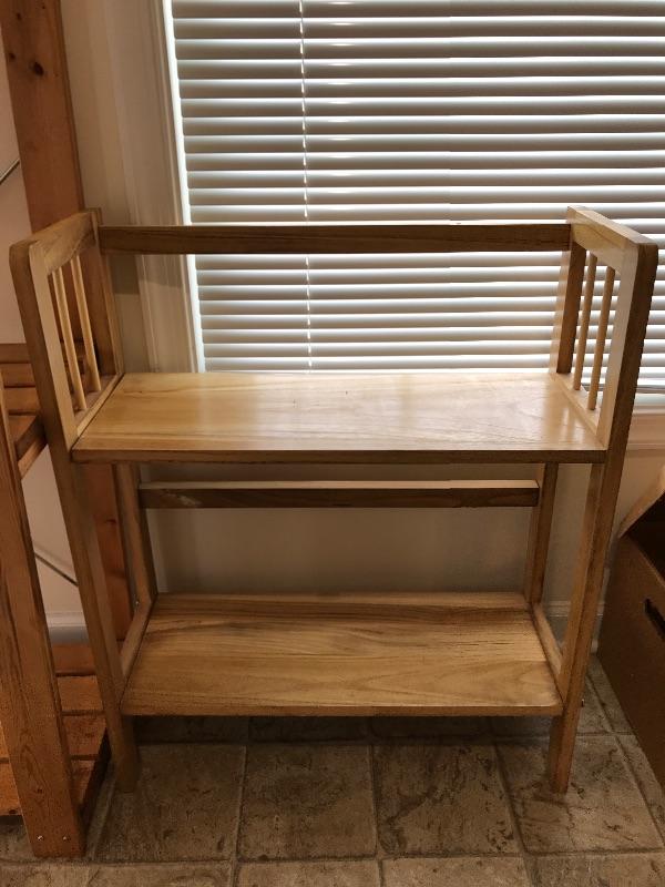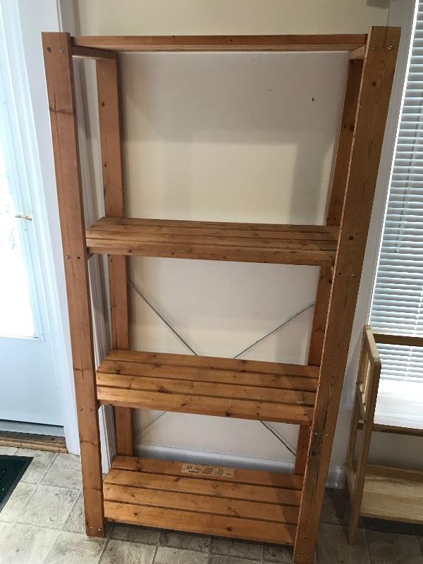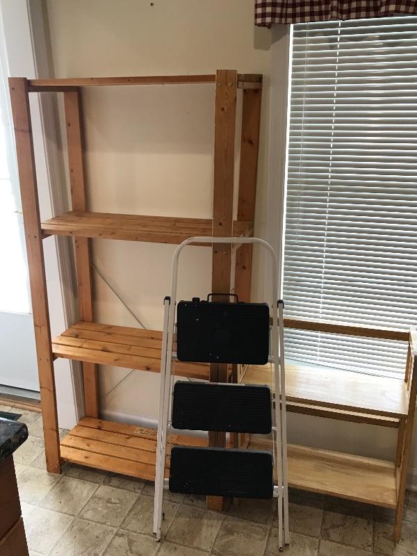 This lot contains two wooden shelves and one step ladder. Step ladder has three steps, a safety lock, is made by skinny mini and measures 3’ 8-1/4” tall. Small wooden shelf with two shelves measures 29 1/2 inches tall 24 1/2 inches wide and 9 1/2 inches deep. Large wooden shelf is made by IKEA has four shelves and measures 63 inches tall, 31 inches wide, and 13 1/2