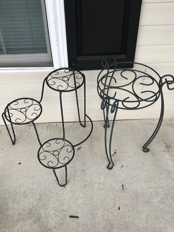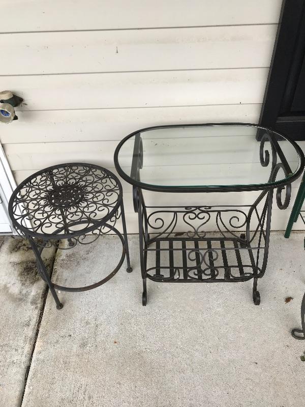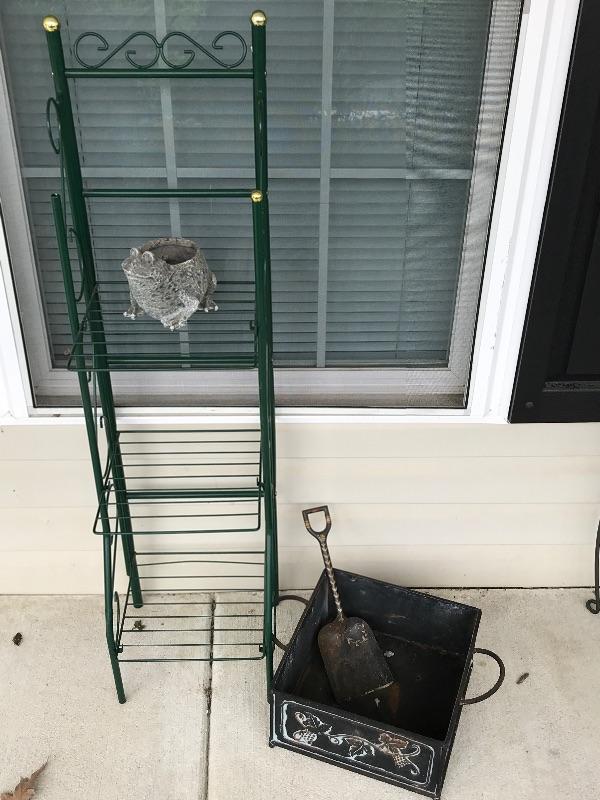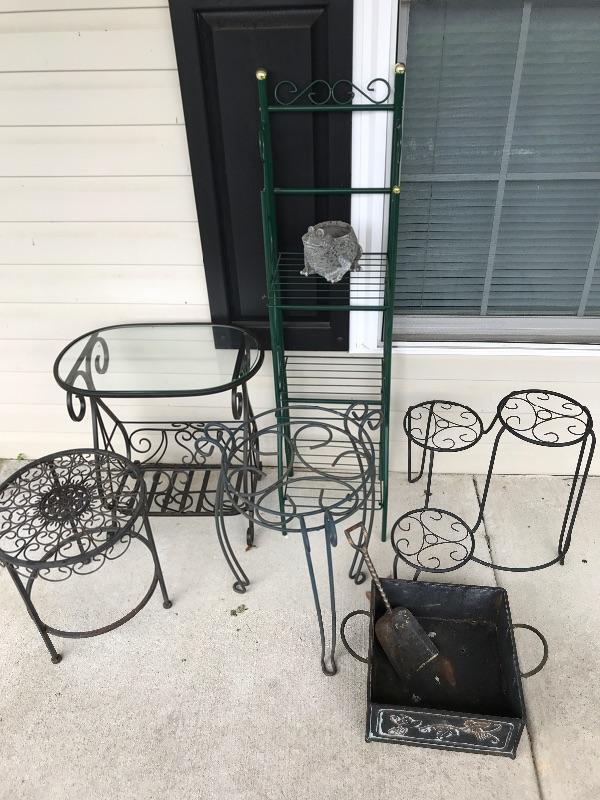 This lot contains plant stands and garden decor Small round table/stand measures 16 inches tall and 13 1/2 inches round, Small glass top table measures 21 1/2 inches tall 20 inches long and 13 inches deep, small green shelf has three shelves and measures 45 inches tall 12 inches wide and 10 1/2 inches deep, small round plant stand measures 21 inches tall And 12 1/2 inches round, small three tier plant stand measures 19 inches tall,metal box plant pot With small metal shovel , box measures 12“ x 12“ in 6 1/2 inches tall. All items in this lot are metal except frog planter