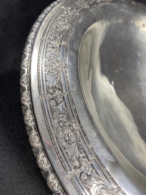 Out of -round. Alternating flower relief. 619g total weight. Measurement: 12" diameter x 3 1/2"H