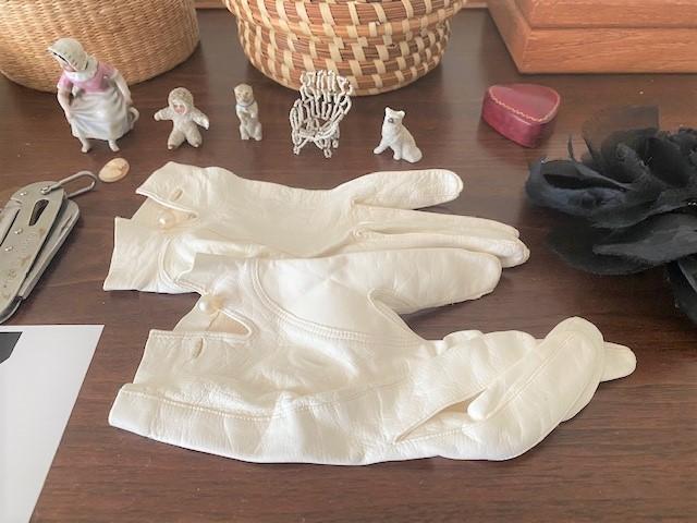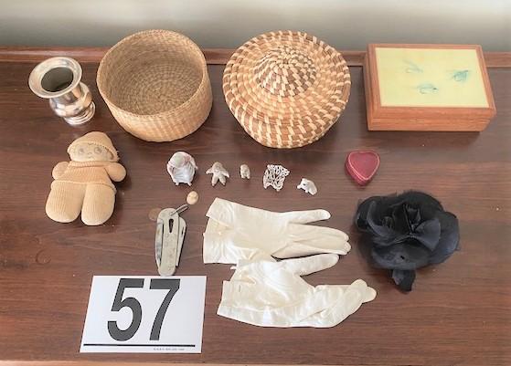 Includes: baskets, small décor, white leather gloves & antique doll