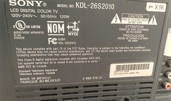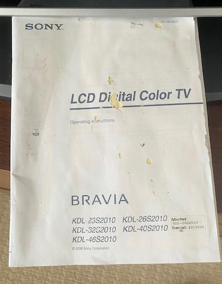 Model KDL-26S2010. Manufactured September 2006. LCD Digital Color TV. With Manuel & remote.