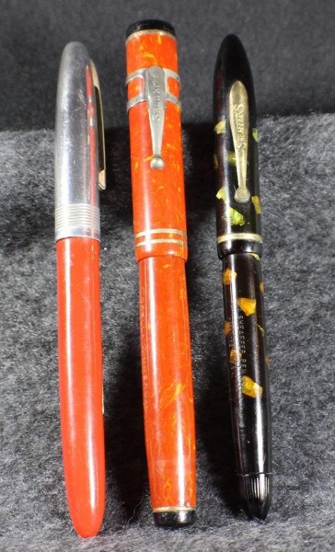 WearEver Red Fountain Pen [Brushed Chrome Can & Red Body] , Whal Signature 14K Gold Nib Fountain Pen [Corella Zimmerman Co 'Security Clip] , Sheaffer Black w/ Flacks Fountain Pen.