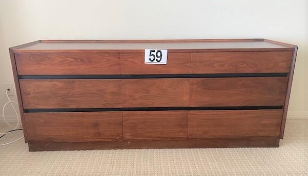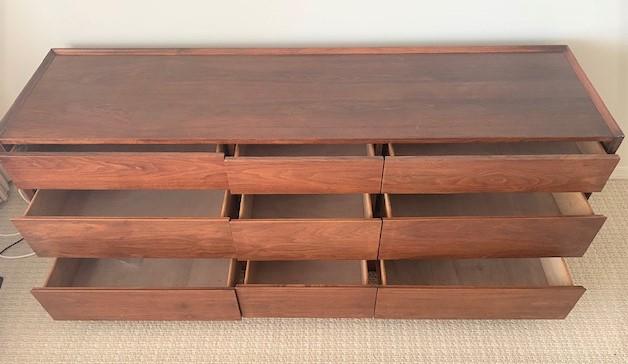 Rosewood in color. One piece. 9 drawers. Appears to have some water damage to side. Measurement: 72"W x 29"H x 18 1/2"D