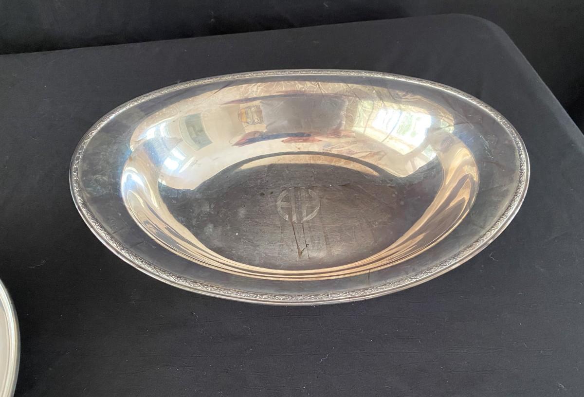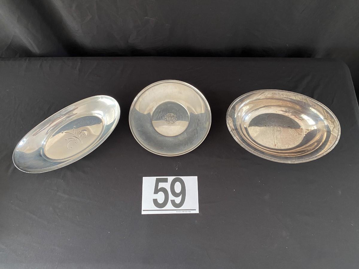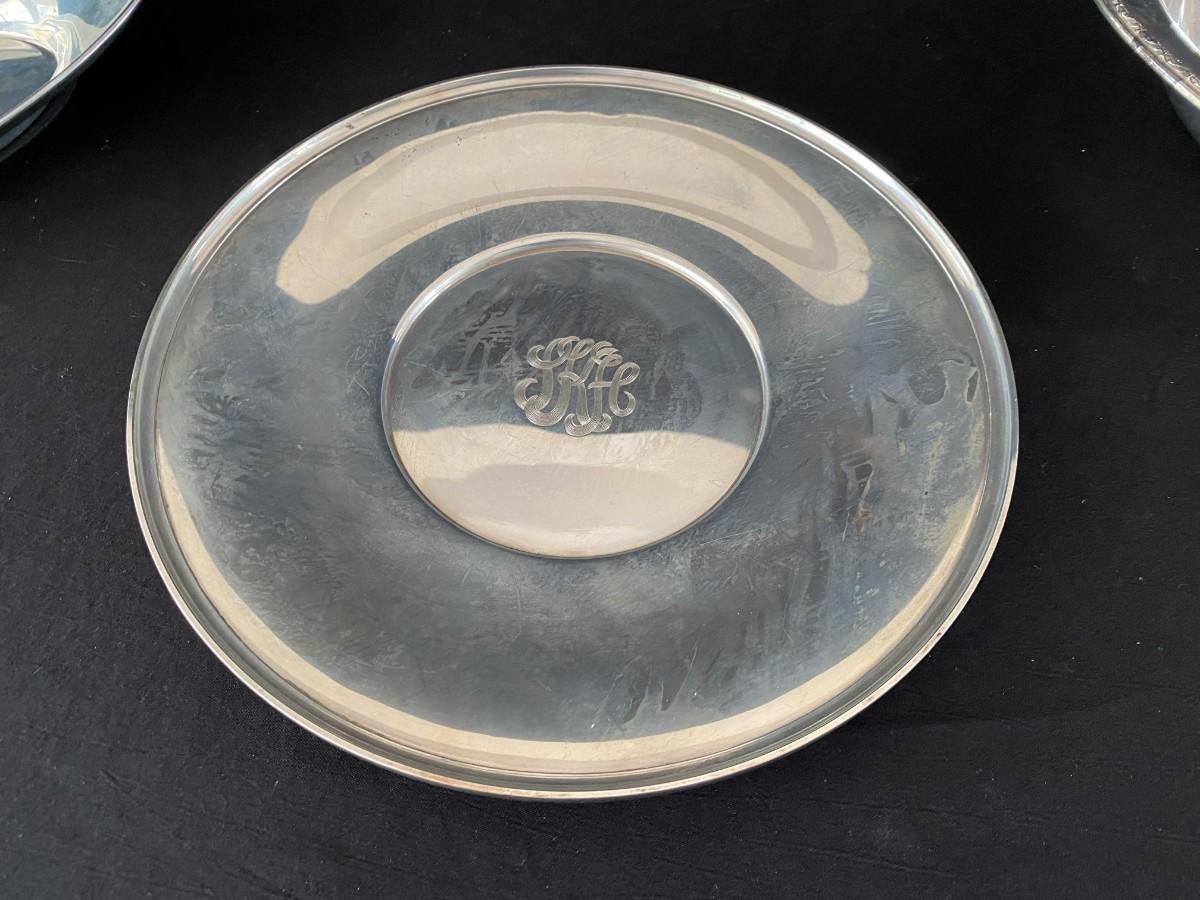 Gorham, Fisher, and other. Two bowls and a plate. Two pieces are monogrammed. 699 grams. Estimated weight of lot: 5 lbs. Measurement: 3 1/2"H x 12"W (together)