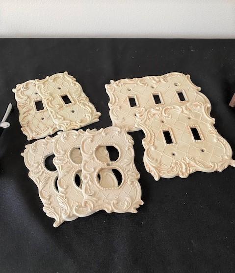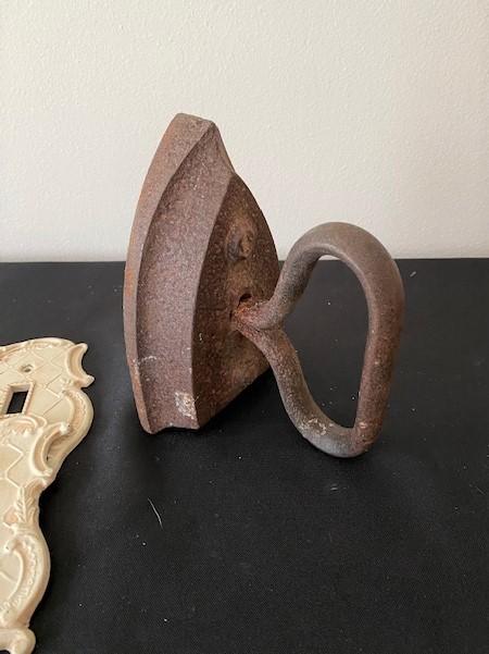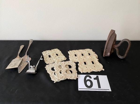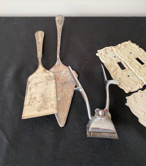 Antique iron, provincial style cast switch plates, silver-plate serving wear & manual animal hair clipper. Estimated total lot weight: 10lbs.