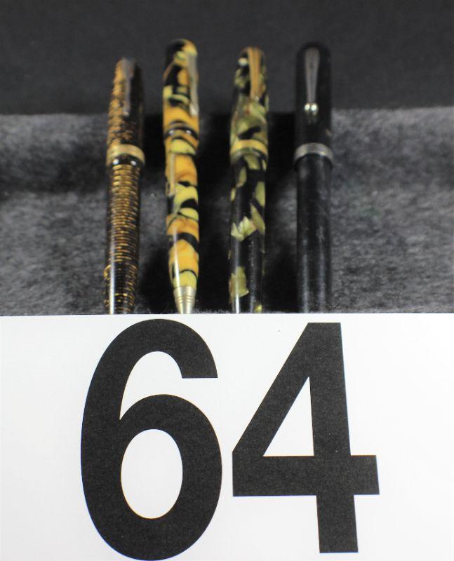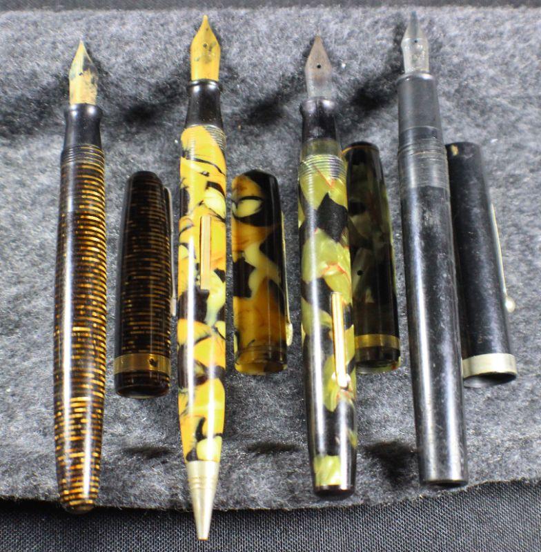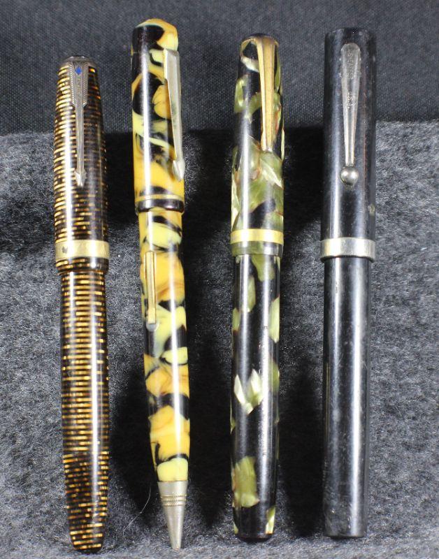 Parker Brown/Gold Stripe Fountain Pen [ 1938-1949 Gold Stripe Vacuumatic] , Parker Duo Fold Mechanical Pen/Pencil Fountain Pen [1920s Pen/Pencil] , WearEver Davif Kahn Deluxe 100 Fountain Pen [1946 North Bergen NY Black & Green] & Sheaffer Black Fountain Pen [Black]