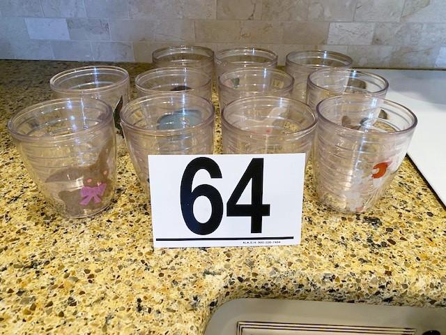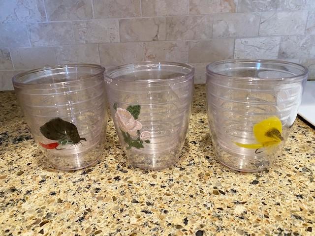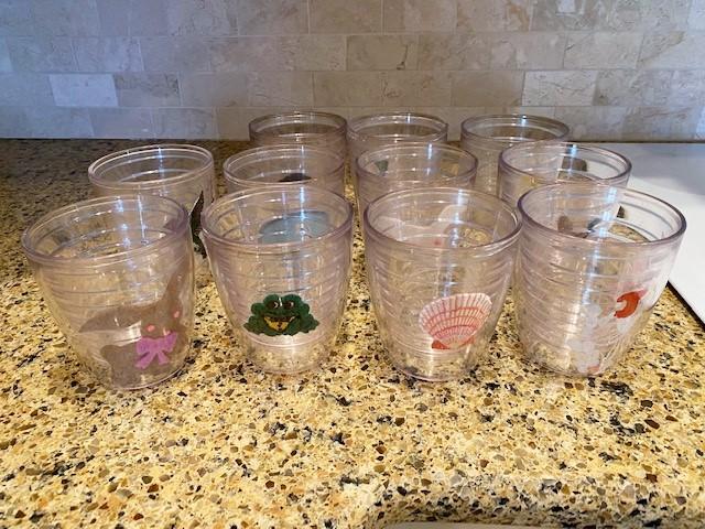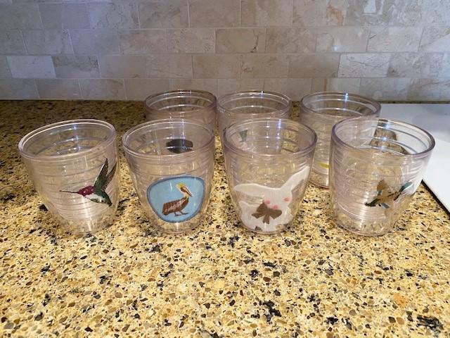 Small tumblers. Pelicans, hummingbirds, seashells, fishing flies, duck, and more. Total of 11.