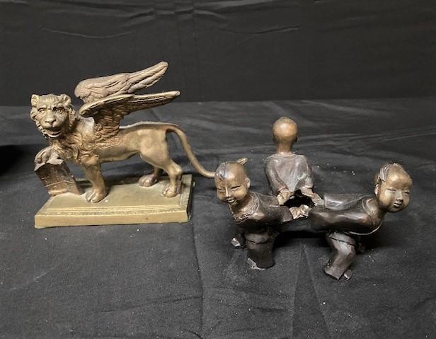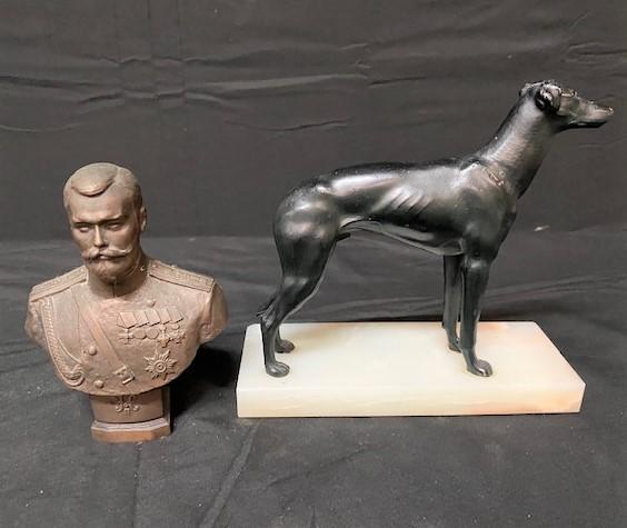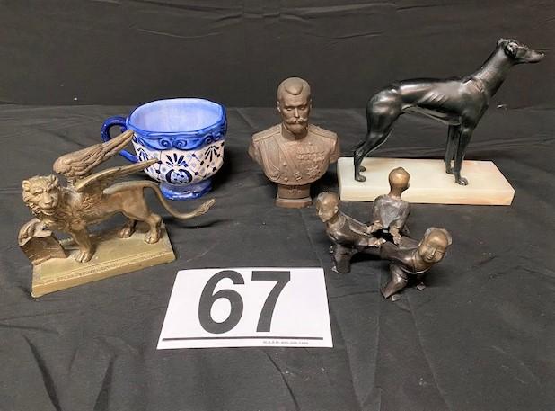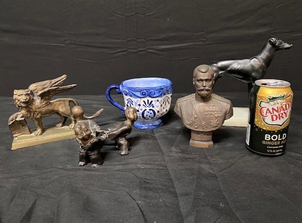 2 bookends, painted Lisbon mug, bust & children in a ring. 5 pieces. Measurement: 8"L x 8"H (dog bookend)