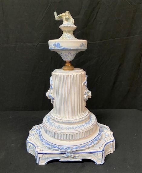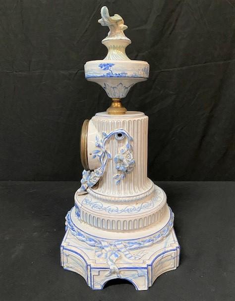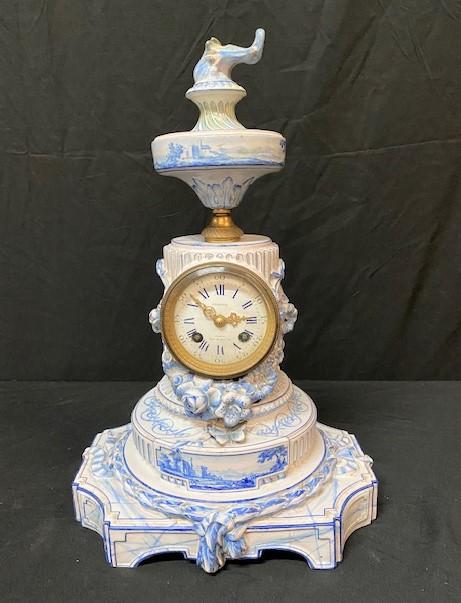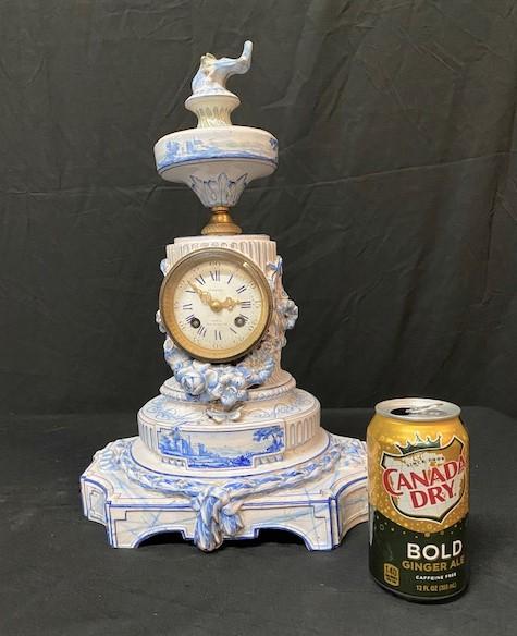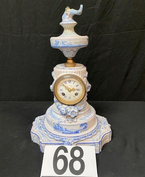 Not working. No key. Blue & white porcelain. Glass is intact. Estimated total lot weight: 5lbs. Measurements16"H x 11"W x 8"D