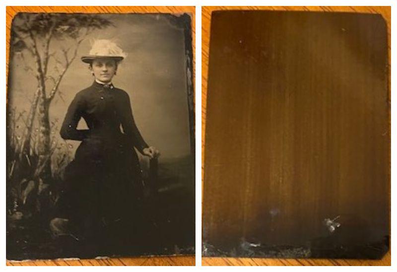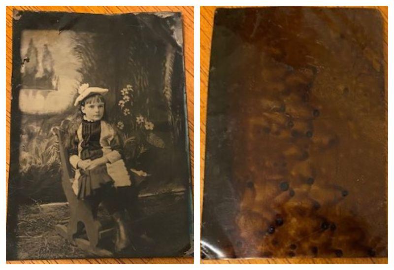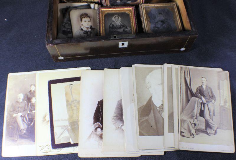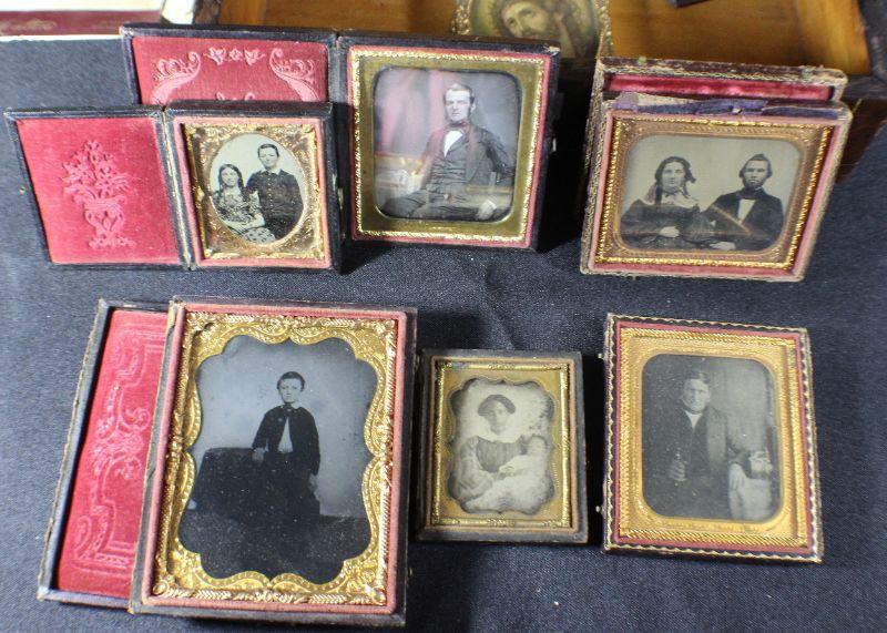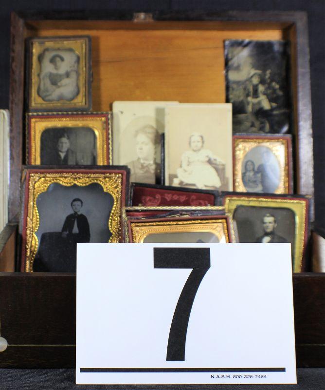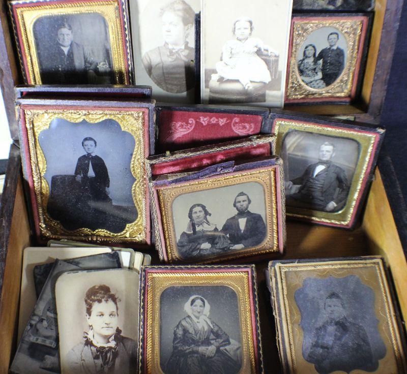 Lot of Daguerreotypes, Tintypes & etc. in wooden box. Box measurements: 11"L x 8"W x 4"H.