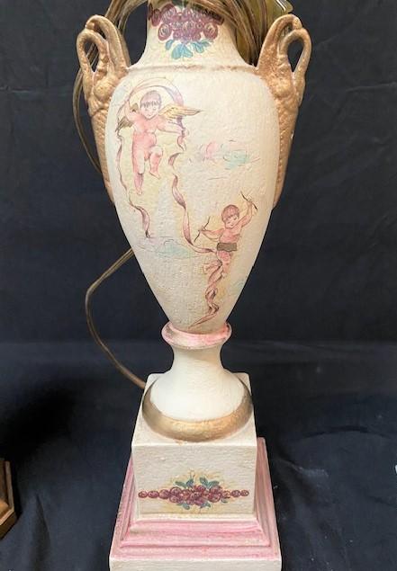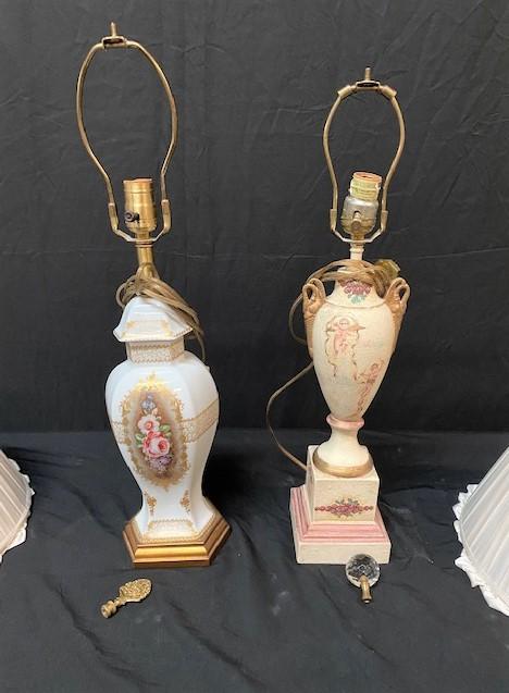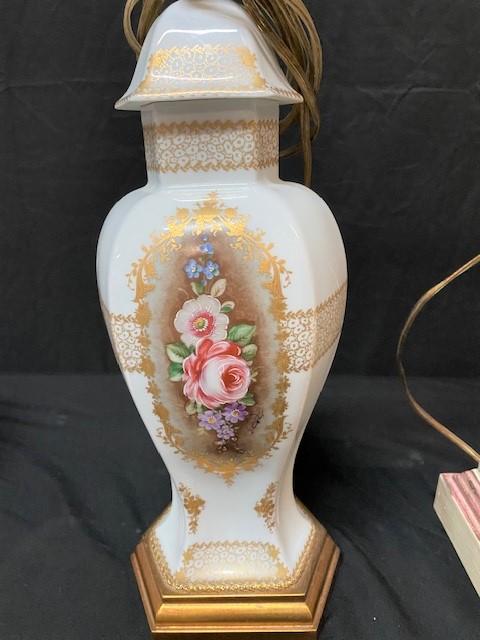 1 porcelain lamp. 1 wooden. Estimated total lot weight. Measurement: 9" H (tallest) x 5" W (widest)
