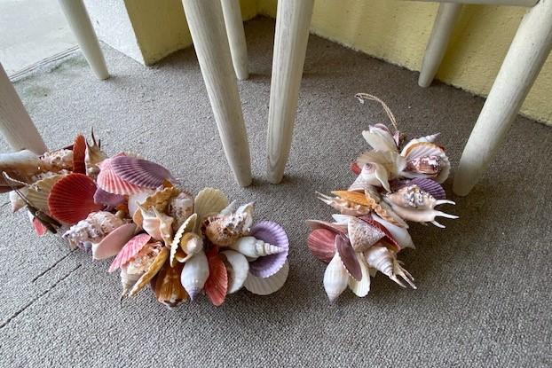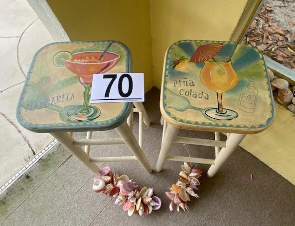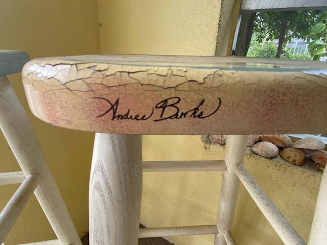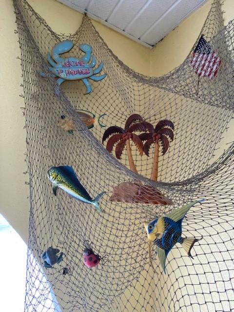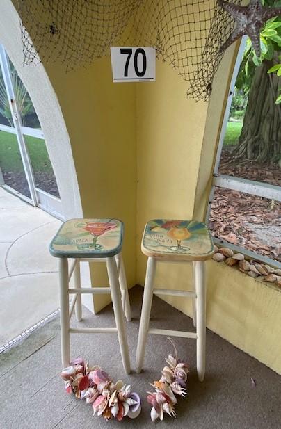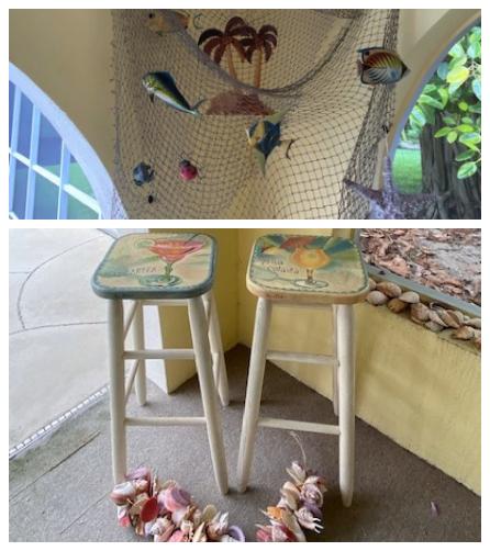 Includes sign, stools, seashells, decorative fish net, and more. Measurement: 30"H (stools, each)