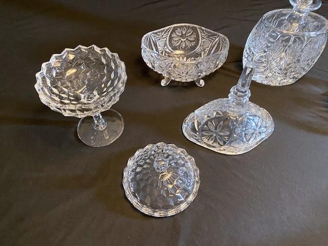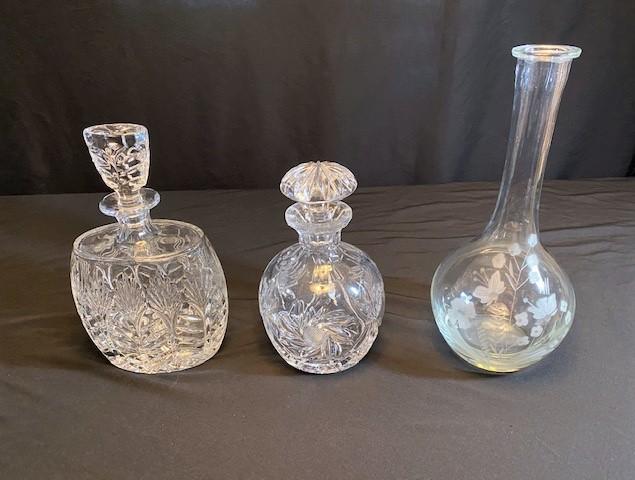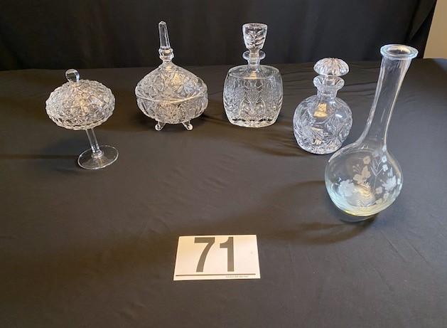 Decanter, candy dish & vase. Quantity 5. Measurement: 10"h x 6"W x 4"dia