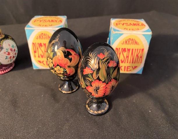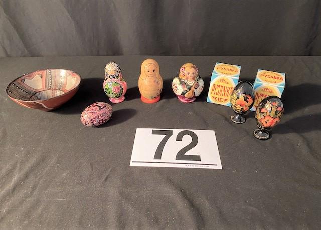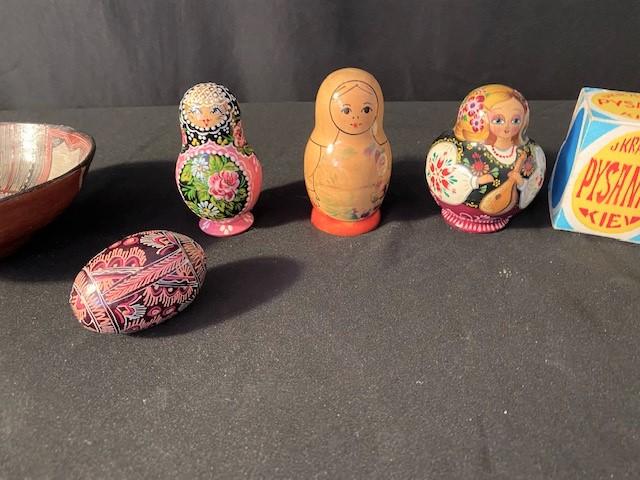 Nesting dolls, bowl, painted eggs. Estimated weight of lot: 3lbs. Measurement: 11" x 8" (largest)