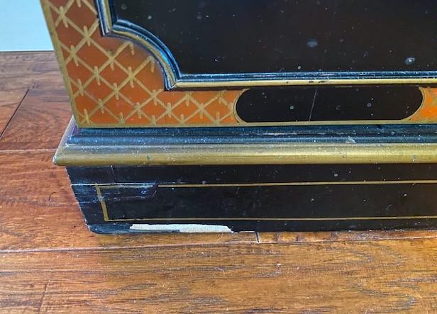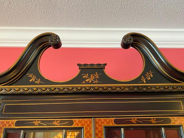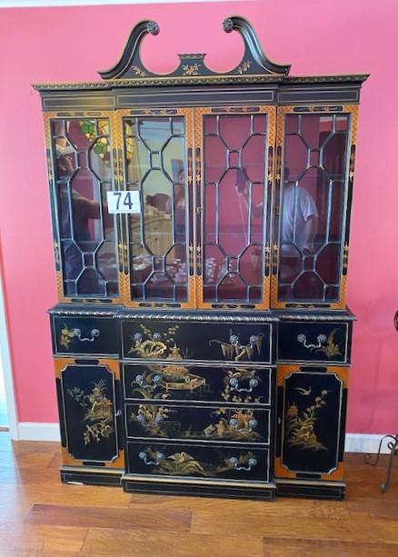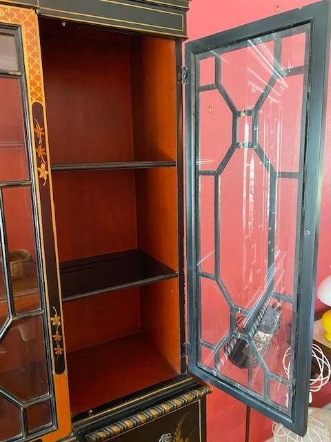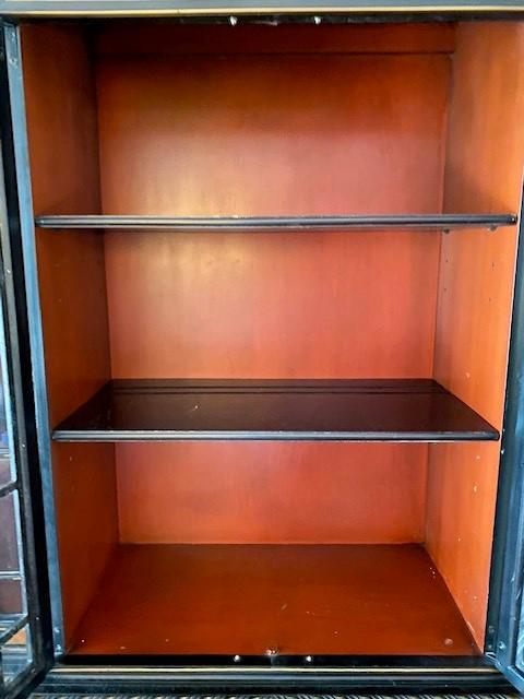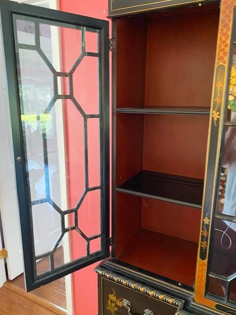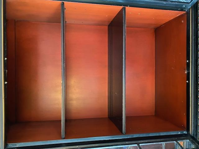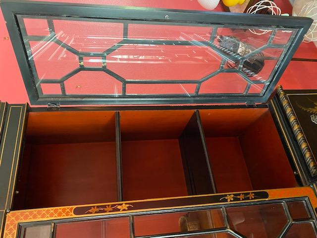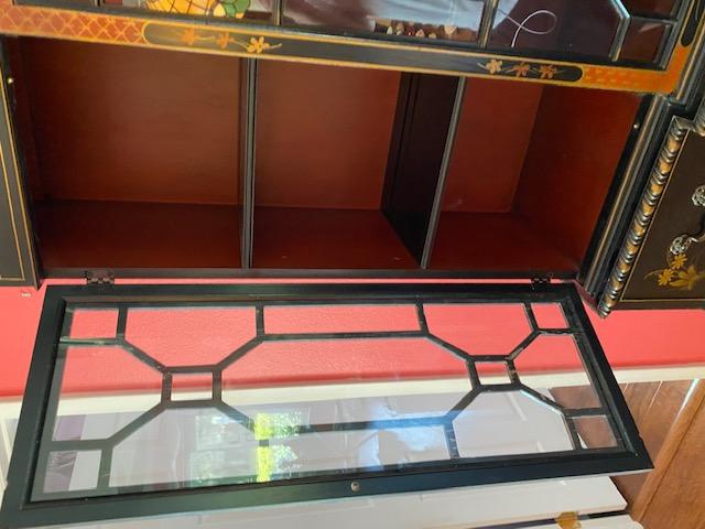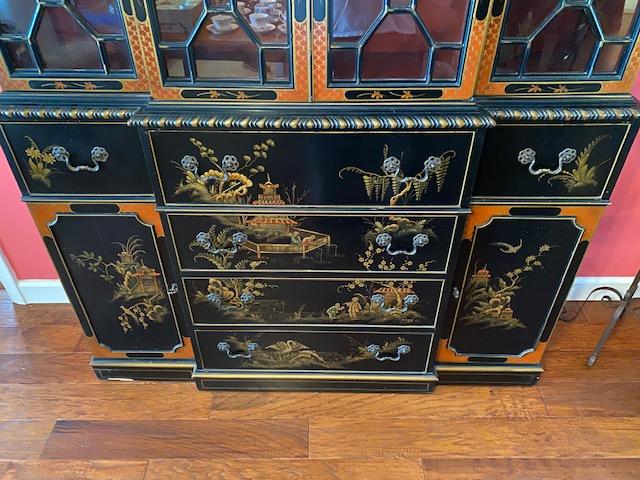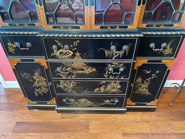 Six drawers and six doors. Includes contents. Some lacquer loss on base (pictured). Measurement: 84"H x 56"W x 13"D