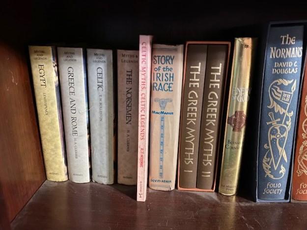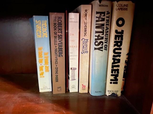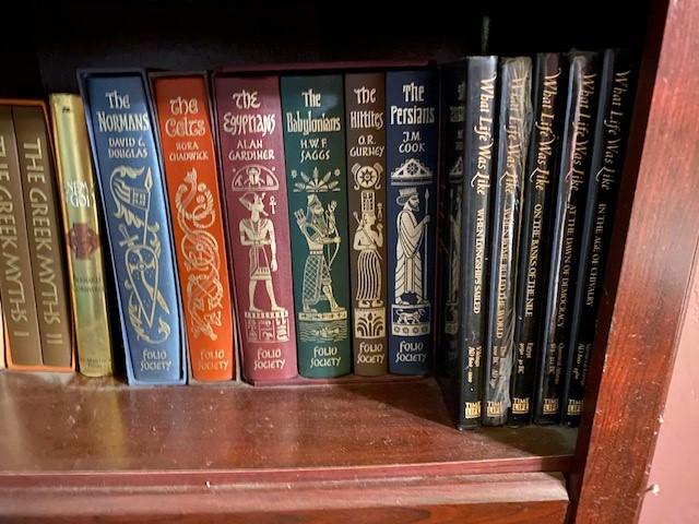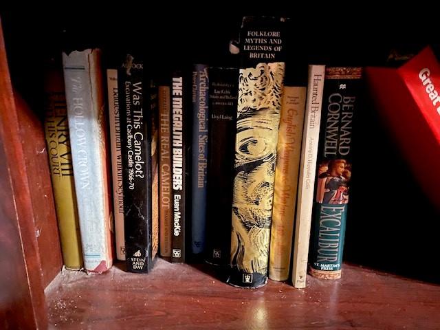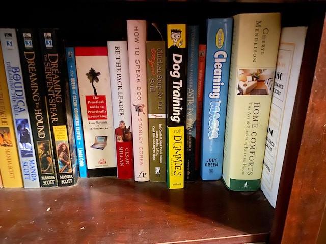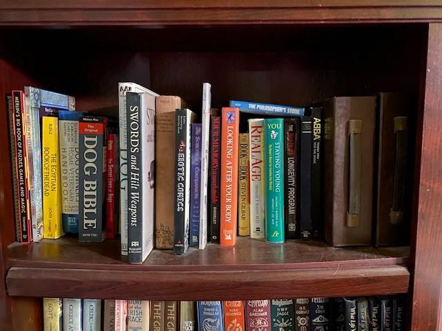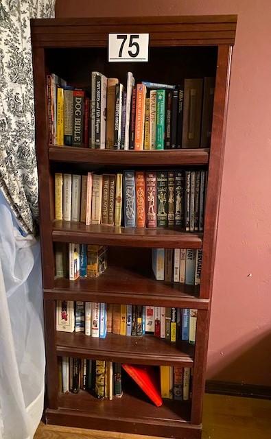 Dark pressed wood 5-shelf unit. Assorted interests: health, pets, Ancient Egypt, DIY, and more. Winning bidder must take ALL items in lot. Measurement: 72"H x 30"W x 12"D