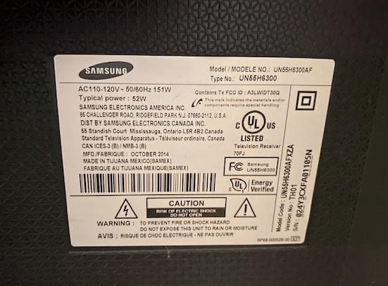 55-inch smart television. Powers on at time of cataloging. Manufactured in October 2014. No remote.