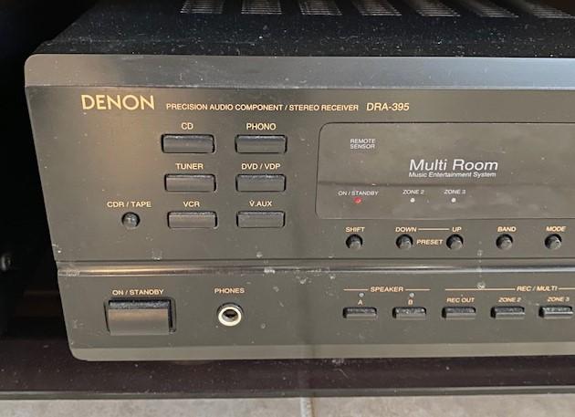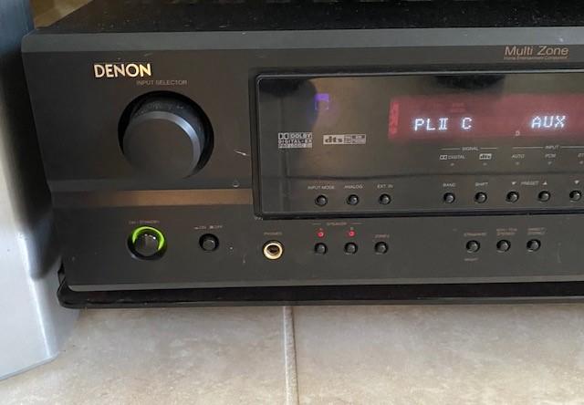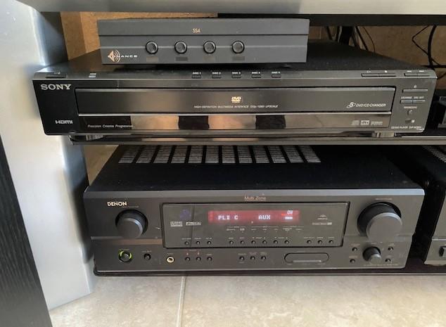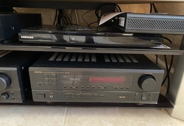 Includes Infinity Powered sub-woofer and center channel, Denon receiver and tuner, Sony DVD player, and Samsung Blu-Ray player. All pieces power on at time of cataloging. TV is NOT included. Includes unopened Roy Rogers DVD box set. No remotes.