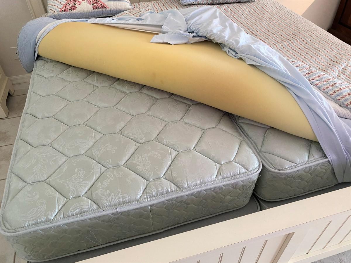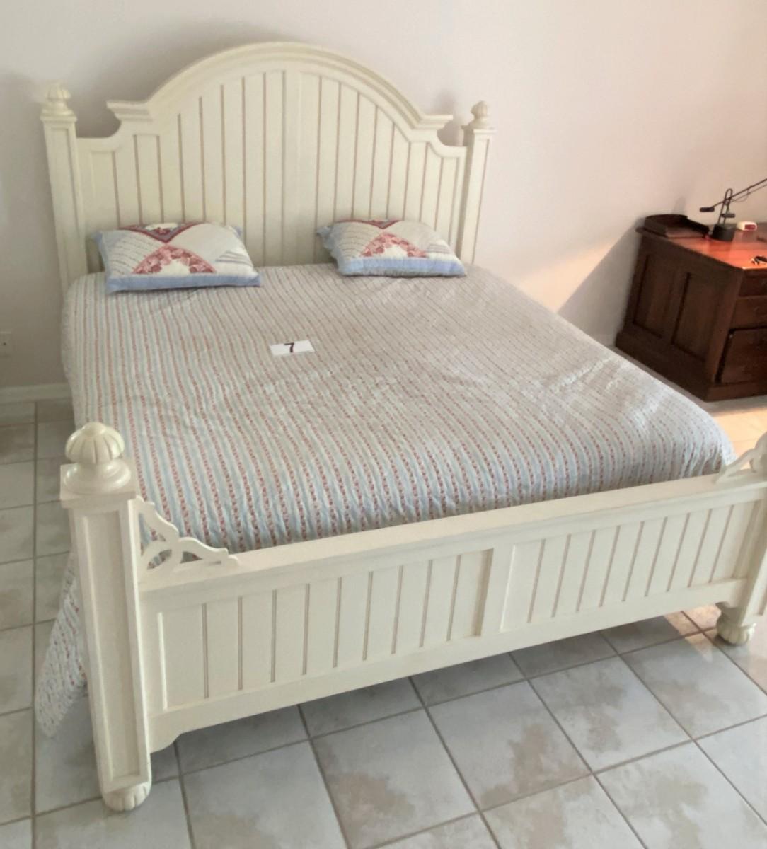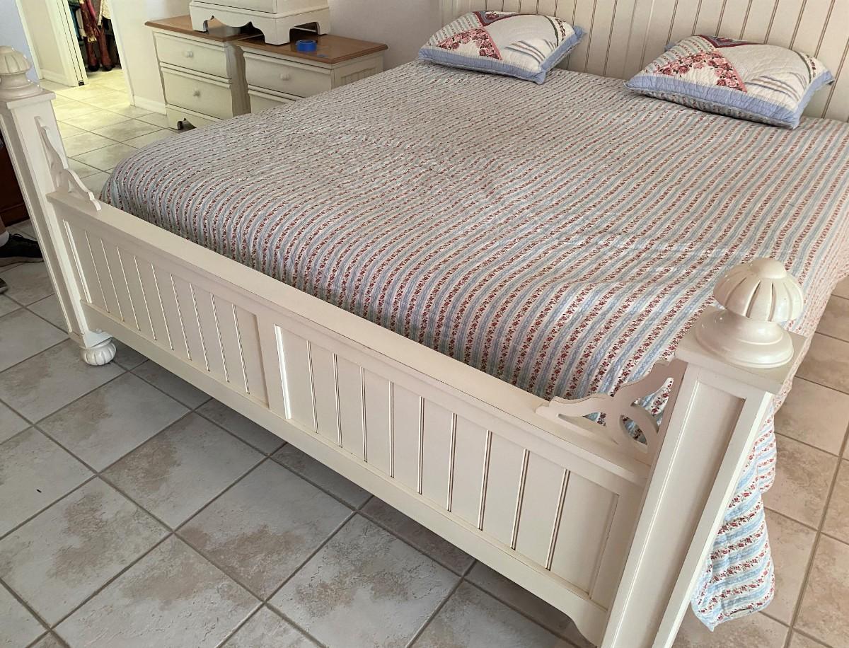 Cottage retreat style. Includes two twin mattresses, headboard, footboard, and bedding.