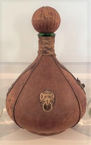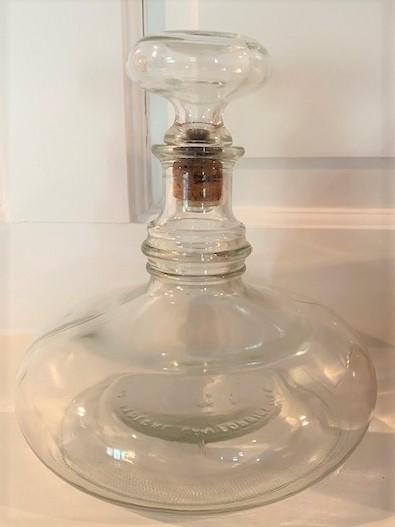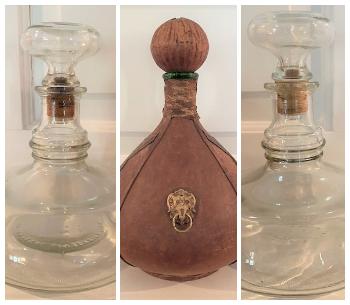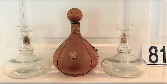 LOT#81D: 2 Vintage/Signed Pressed Glass Decanters & 1 Leather Decanter