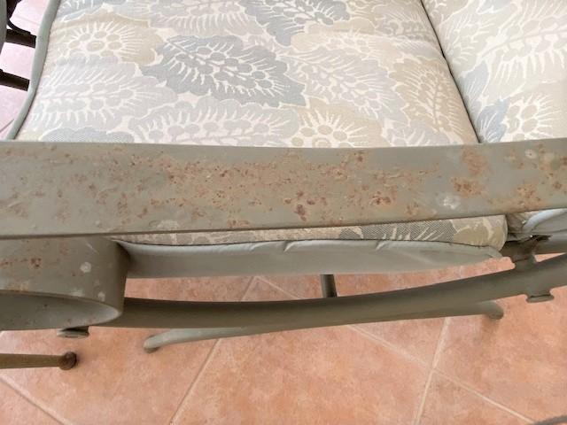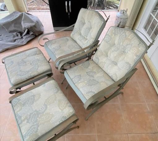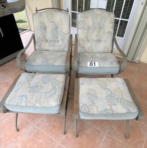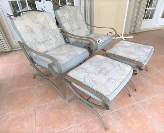 Two chairs; two ottomans. Some surface rust. Estimated weight of lot: 15lbs. Measurement: 25"W x 23"D x 18"H (ottoman; each) / 38"H x 30"D (chair; each)