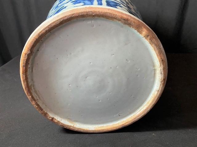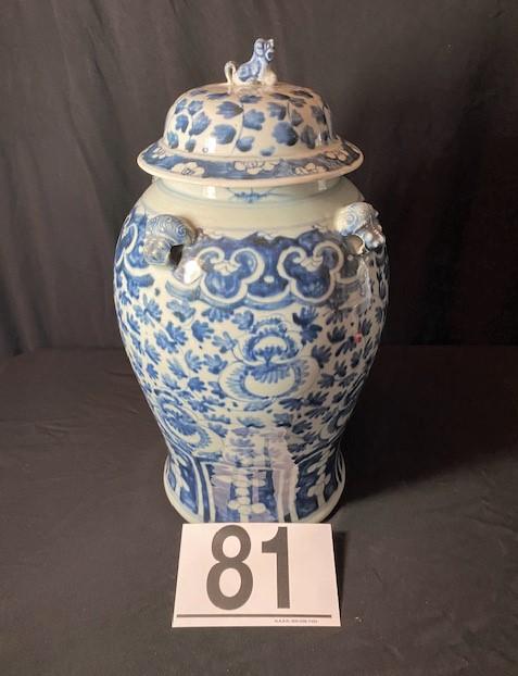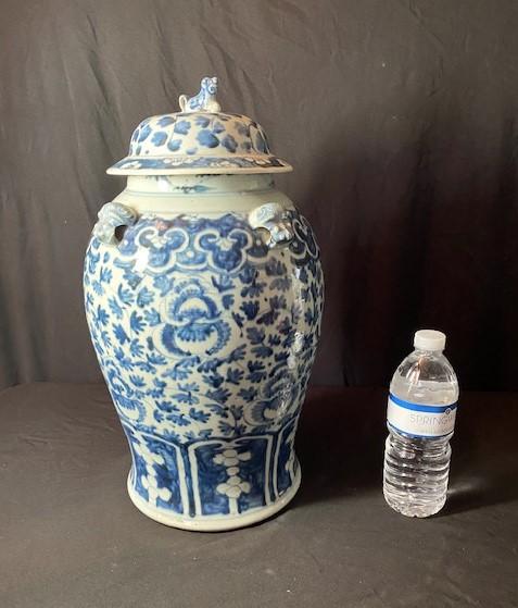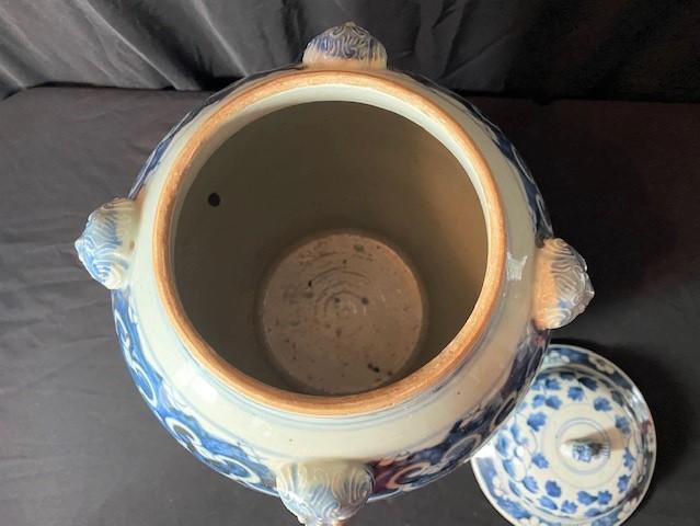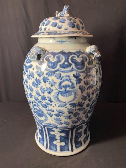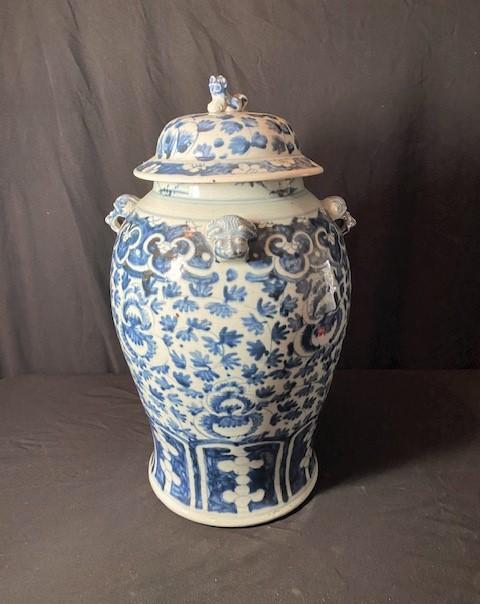 According to appraisal: "Blue and white porcelain covered jar with Foo Dog finial and four applied dog heads at top rim. Probably 19th century based on wear and iron oxide deposition." Estimated weight of lot: 10lbs. Measurement: 17 1/2"H
