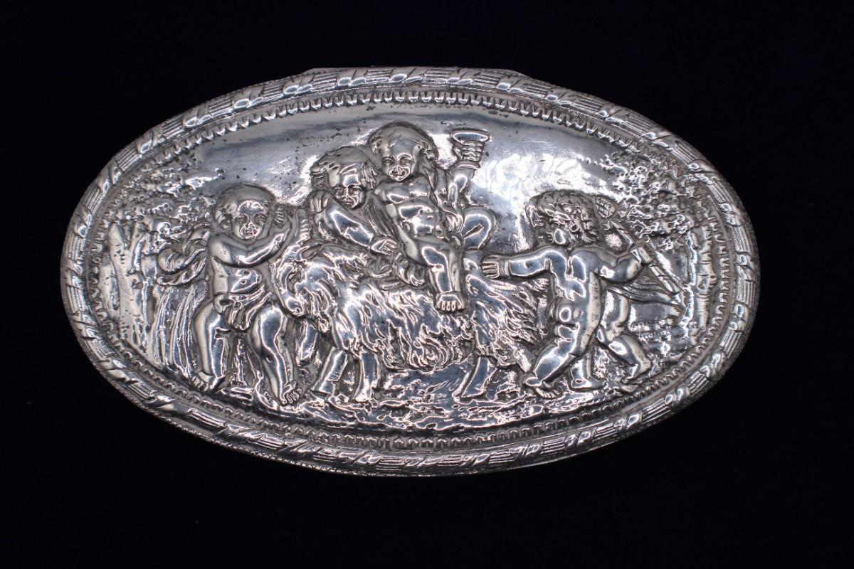 Cherub motif. Measurement: 1.25"H x 5.25W x 3"W. Trinket box marked 800 silver