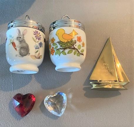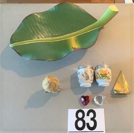 Includes: painted wooden banana leaf, 2 piece Royal Worcester, 2 crystal hearts, brass sailboat trophy & covered decorative egg.