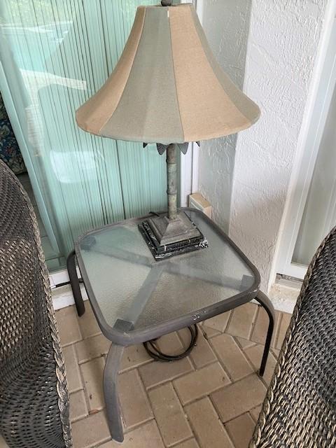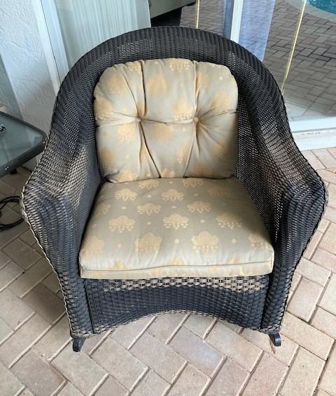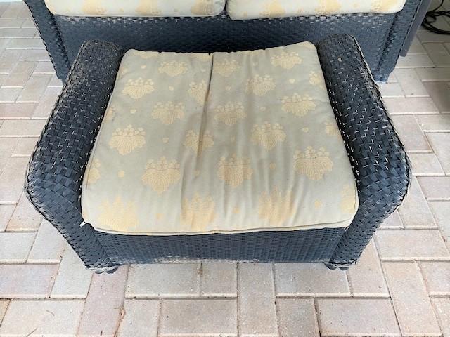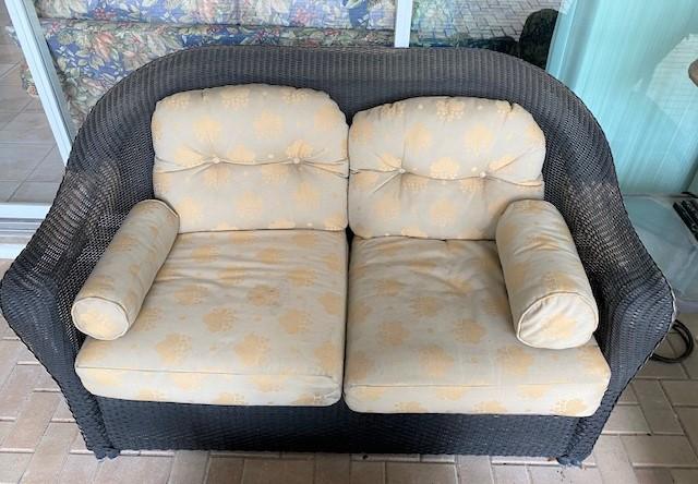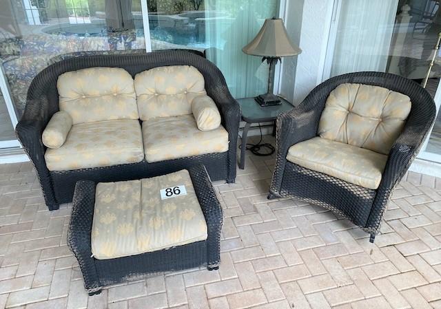 Wicker chair, loveseat, and ottoman. Lamp is rated for outdoor use. Measurement: 34"H x 58"W x 32"D (loveseat)