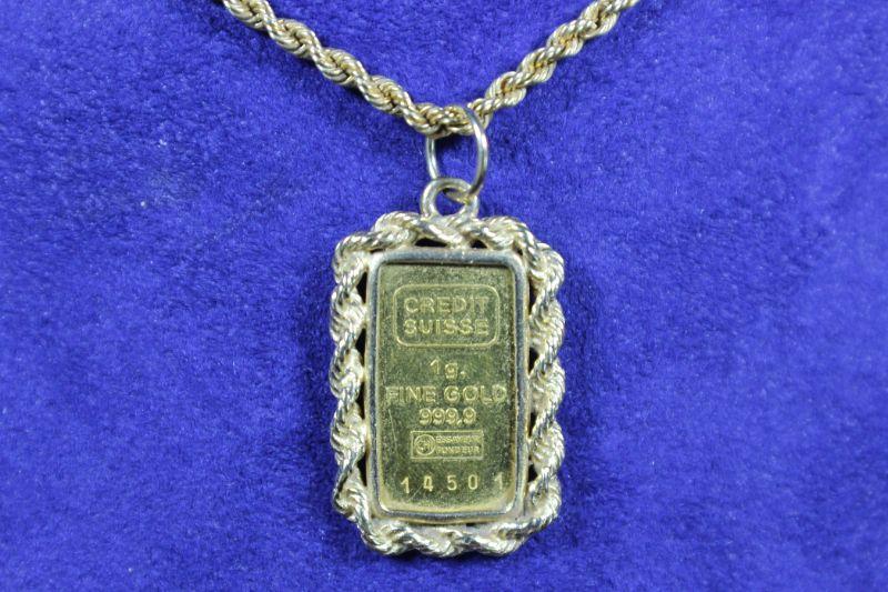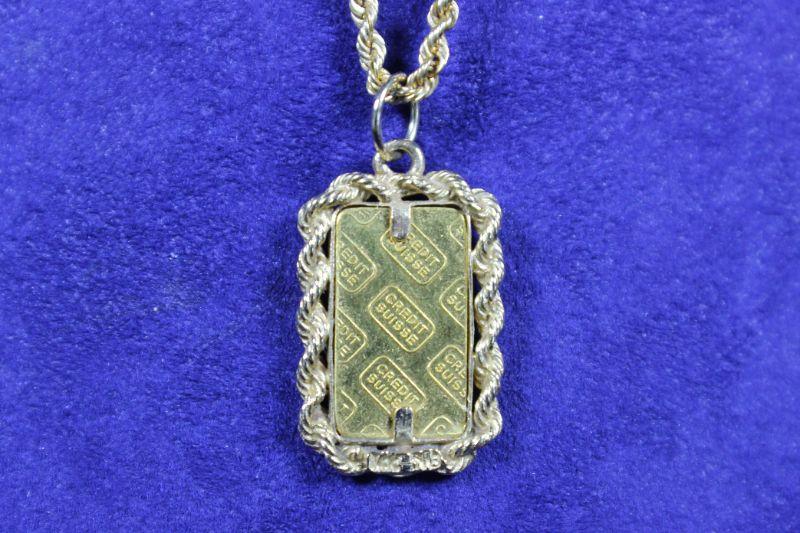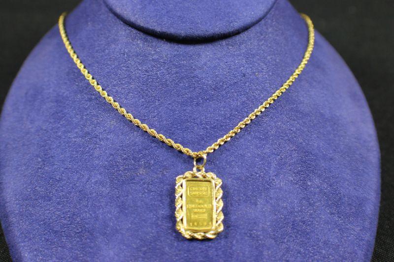 LOT#88: Stamped 14K Gold Chain & 1gram .9999 Bar Pendent